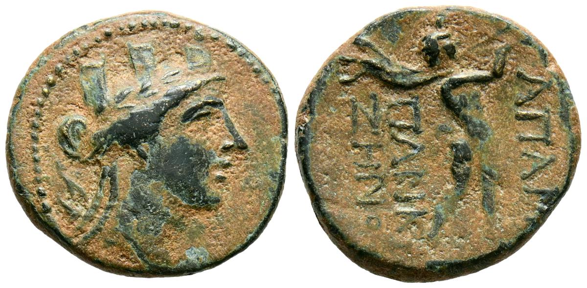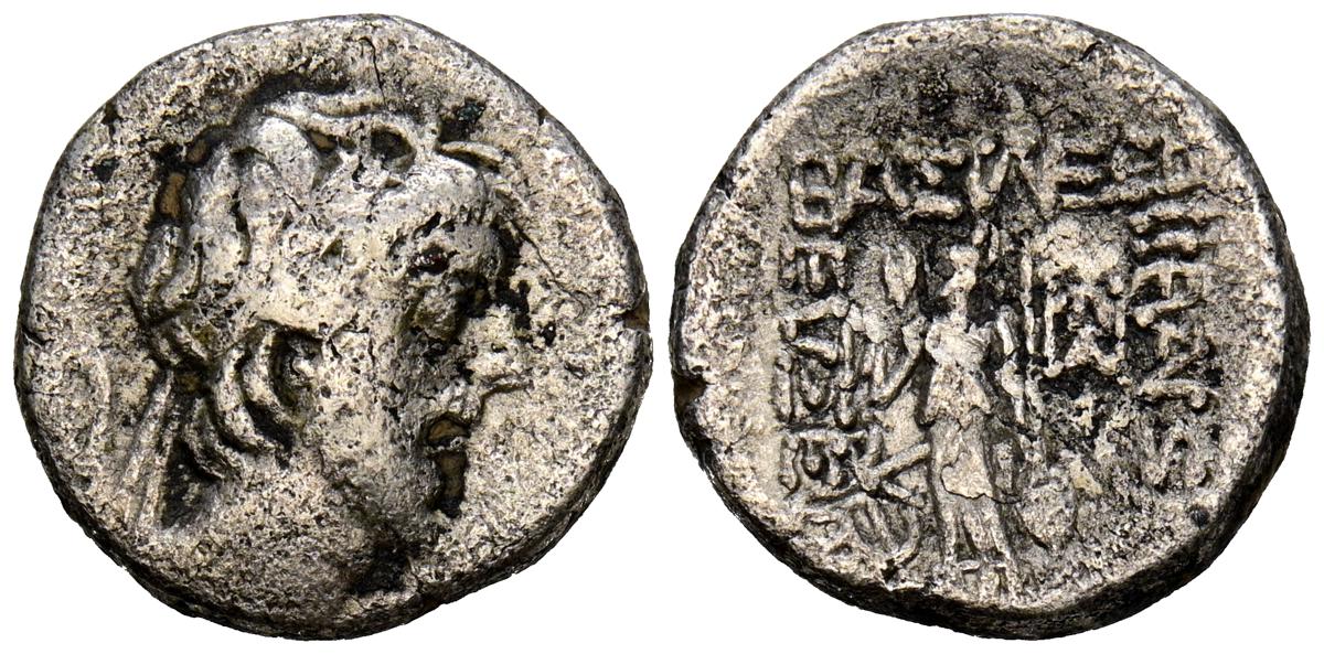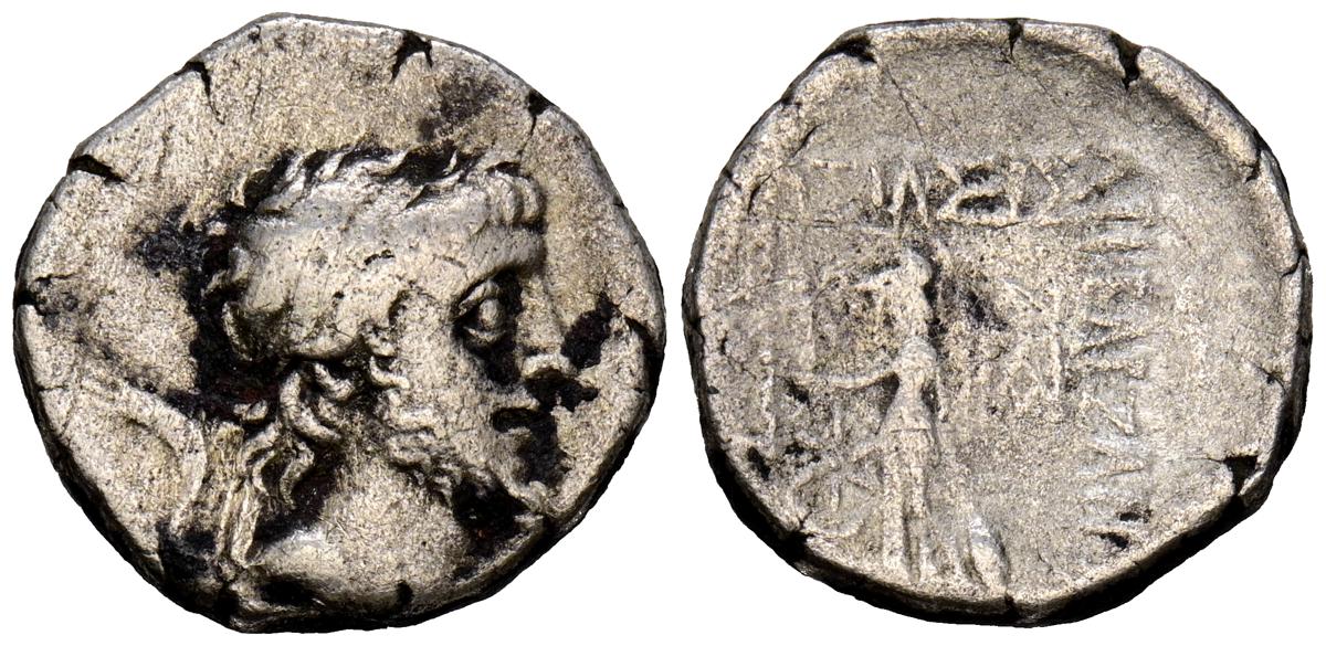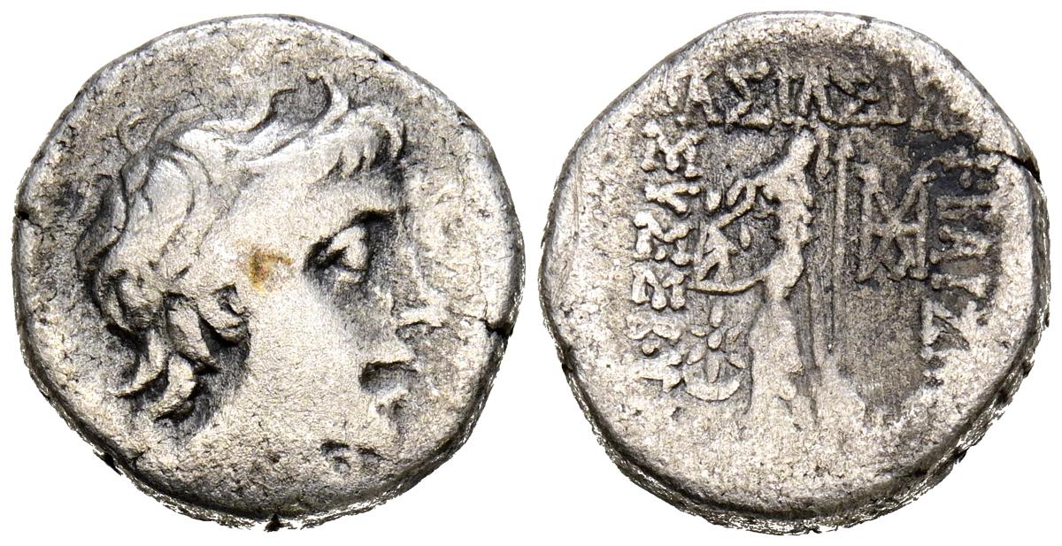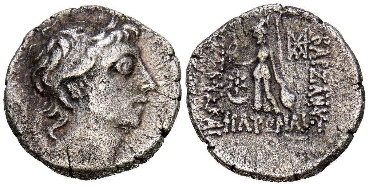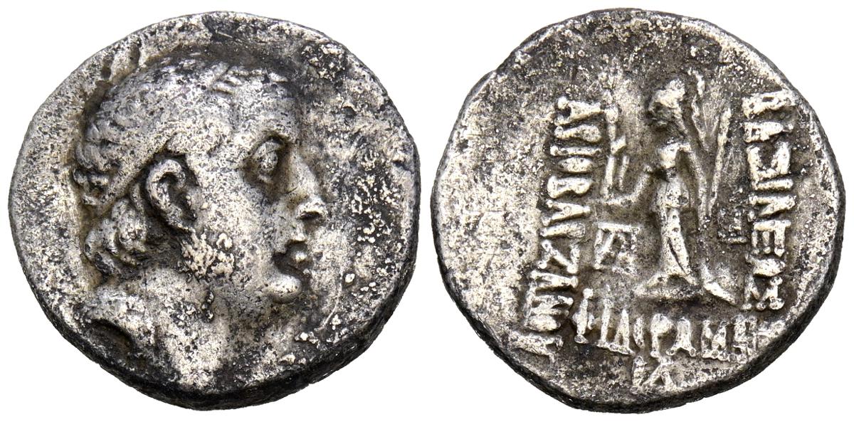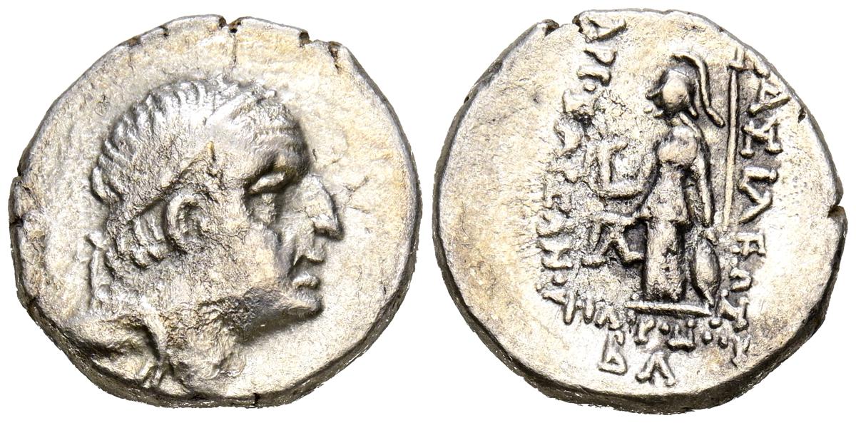 REYES DE CAPADOCIA, Ariobarzanes III Eusebes Philoromaios. Dracma. (Ar. 4,08g/16mm). 52-42 a.C. (HGC 7, 853). Anv: Cabeza laureada a derecha. Rev: Atenas portando Nike con corona de laurel y lanza, detrás escudo, delante estrella y creciente, detrás monograma griego, alrededor leyenda griega: ΒΑΣΙΛΕΩΣ ΑΡΙΟΒΑΡΖΑΝΟΥ ΕΥΣΕΒΟΥΣ ΚΑΙ ΦΙΛΟΡΩΜΑΙΟΥ. MBC-.