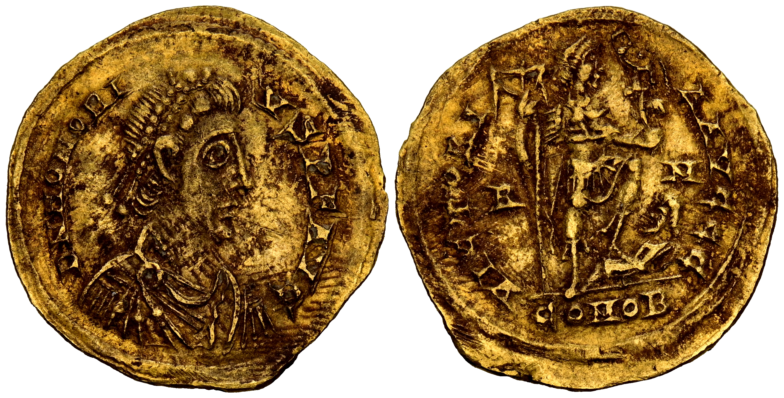 HONORIO. Sólido. (Au. 4,48g/22mm). 407-408 d.C. ROMA. (RIC 1252). Anv: Busto diademado y con coraza de Honorio a derecha, alrededor leyenda: DN HONORIVS P F AVG. Rev: Honorio estante a derecha con pie sobre cautivo portando estandarte y Victoria con corona de laurel sobre globo, entre: R-M, en exergo. CONOB, alrededor leyenda: VICTORIA AVGGG. MBC.