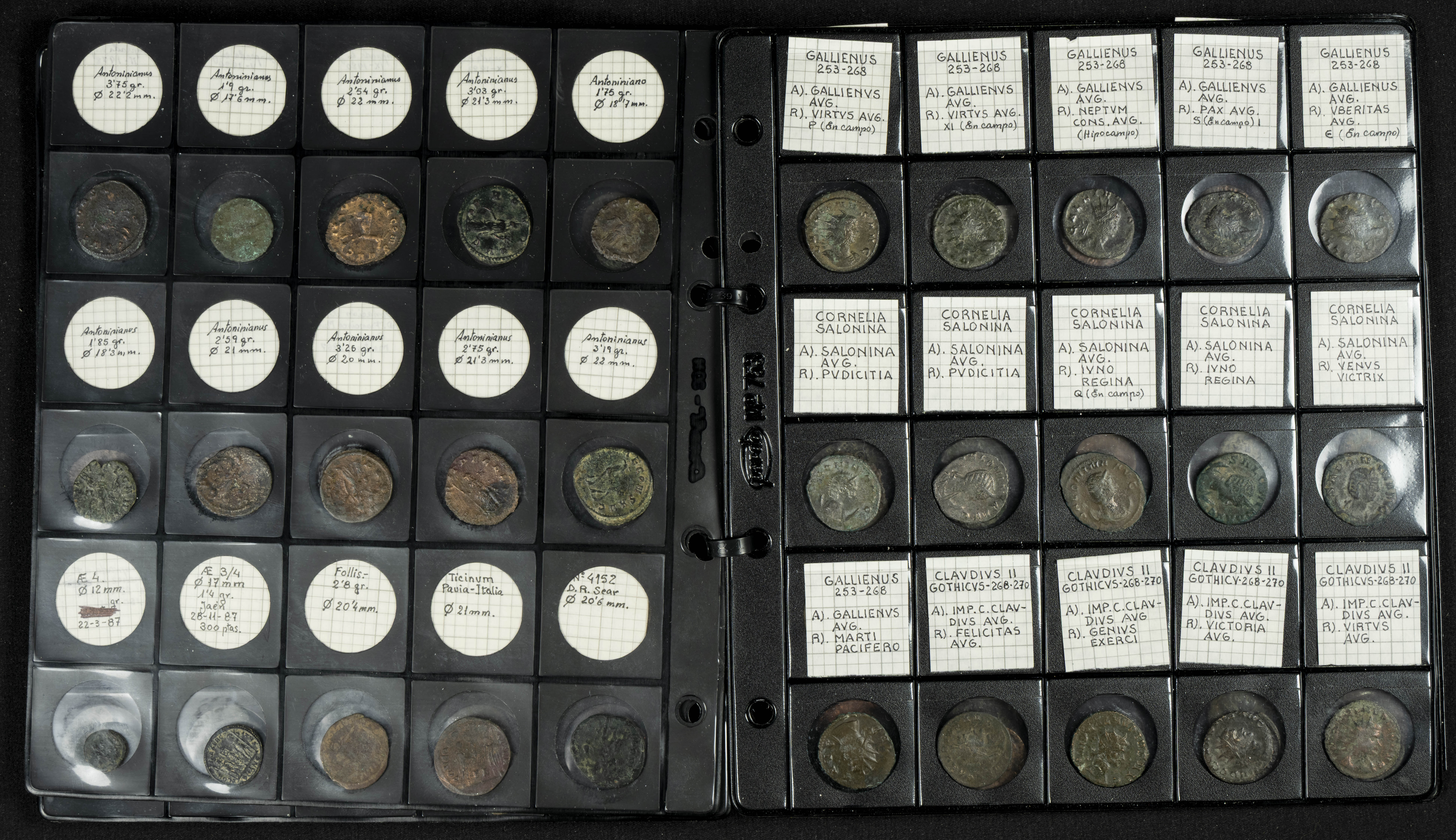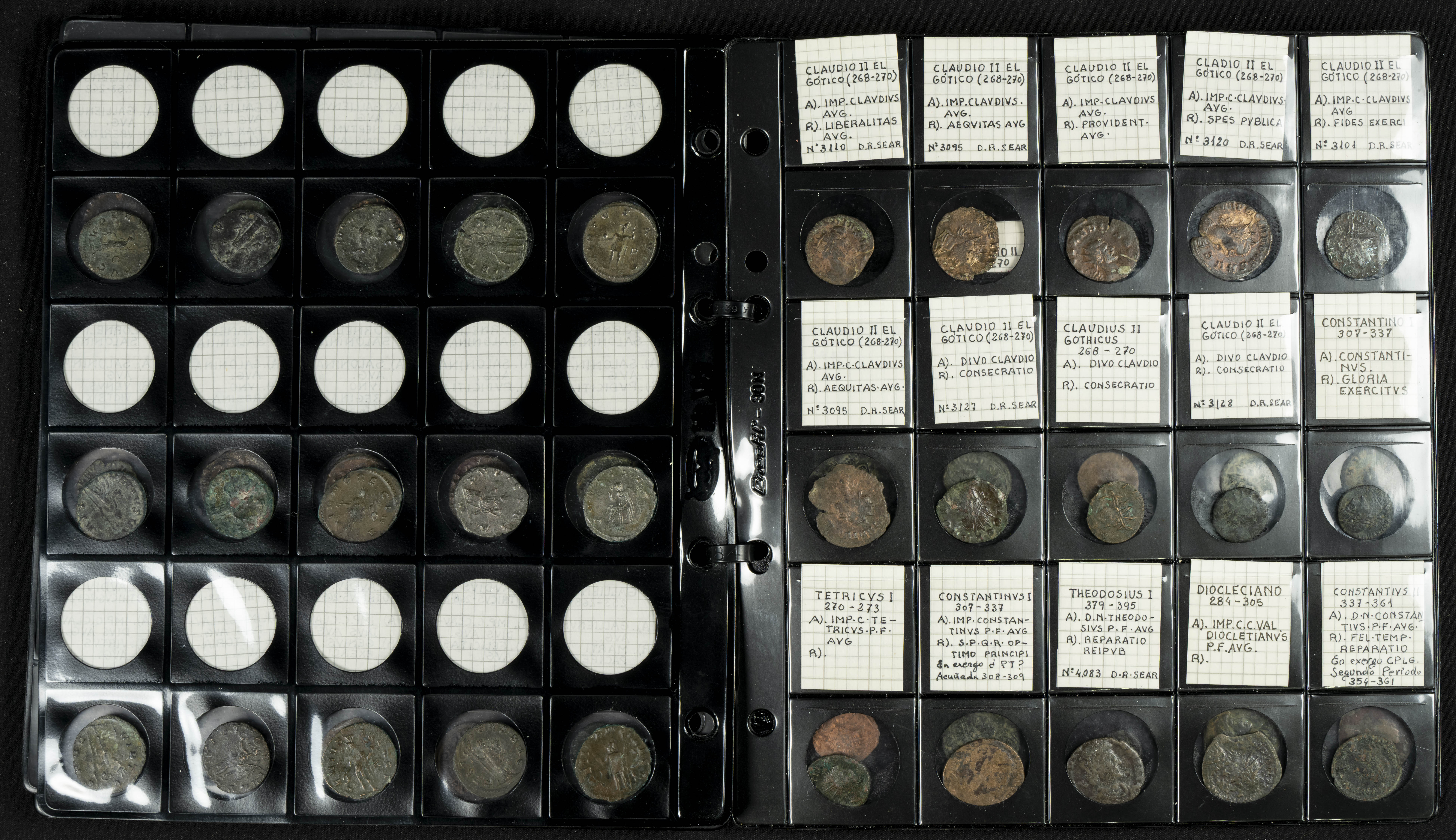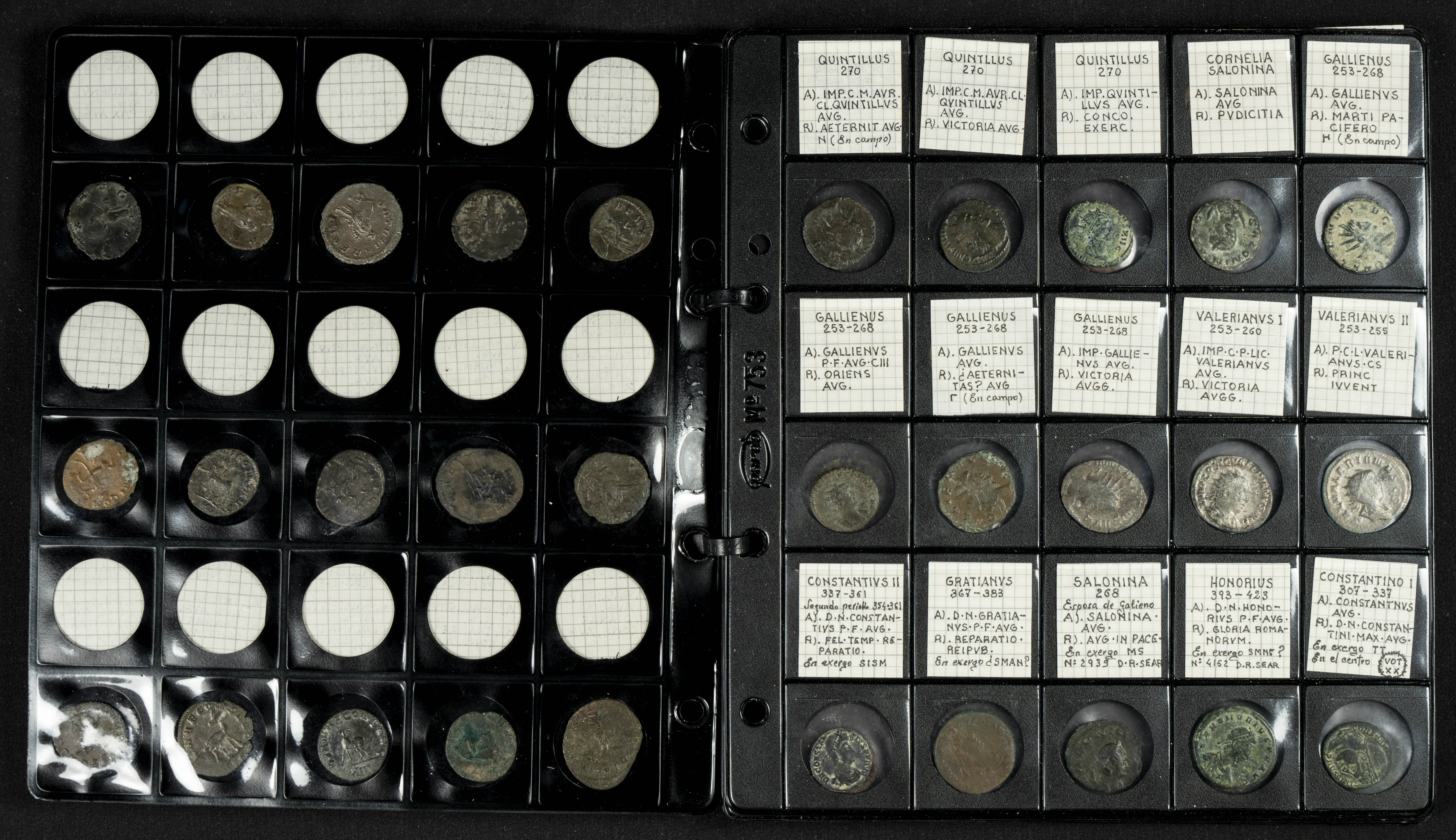 IMPERIO ROMANO. Interesantísima colección antigua compuesta por 100 bonitas acuñaciones de bajo imperio a nombre de los emperadores y emperatrices: Valeriano I, Galieno, Salonina, Valeriano II, Claudio II, Quintilo, Tetrico I, Diocleciano, Maximiano, Constantino I, Constantino II, Graciano, Teodosio I, Honorio, León I. A destacar una llamativa y organizada disposición del conjunto de piezas que van acompañas con cartoncillos de época descriptivos de cada una de ellas. Diferentes metales, módulos, cecas, reversos y estados de conservación. A EXAMINAR.