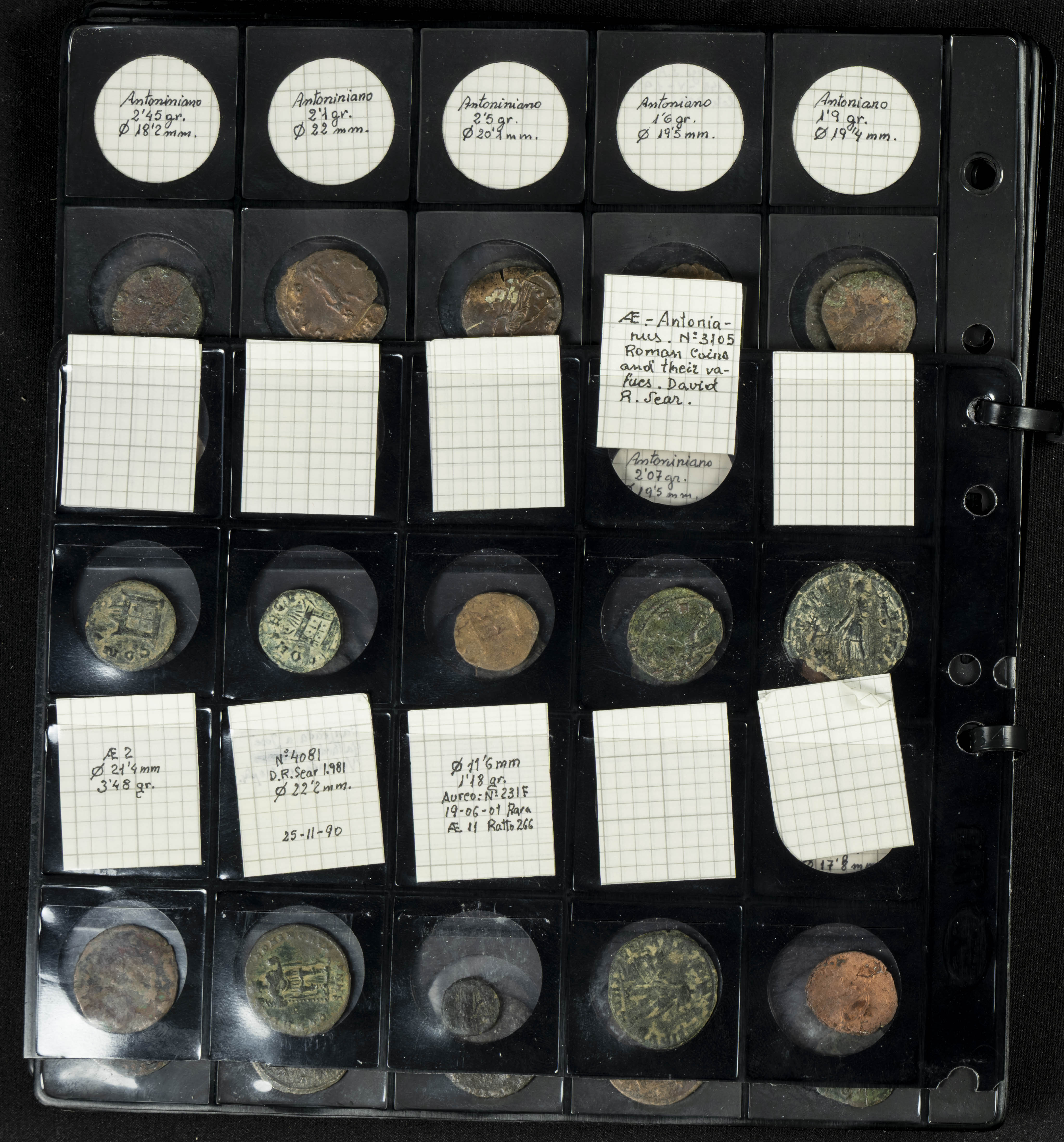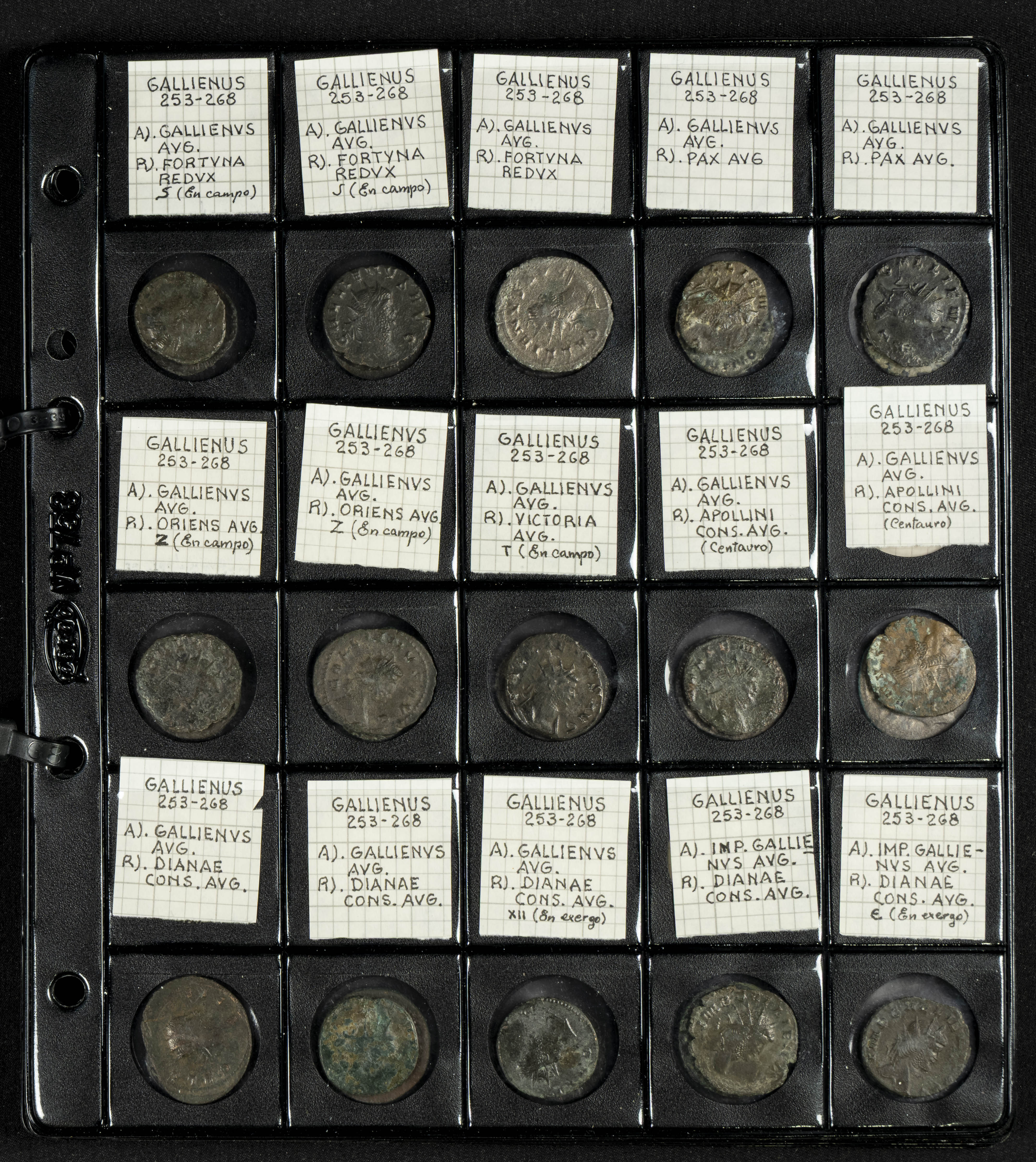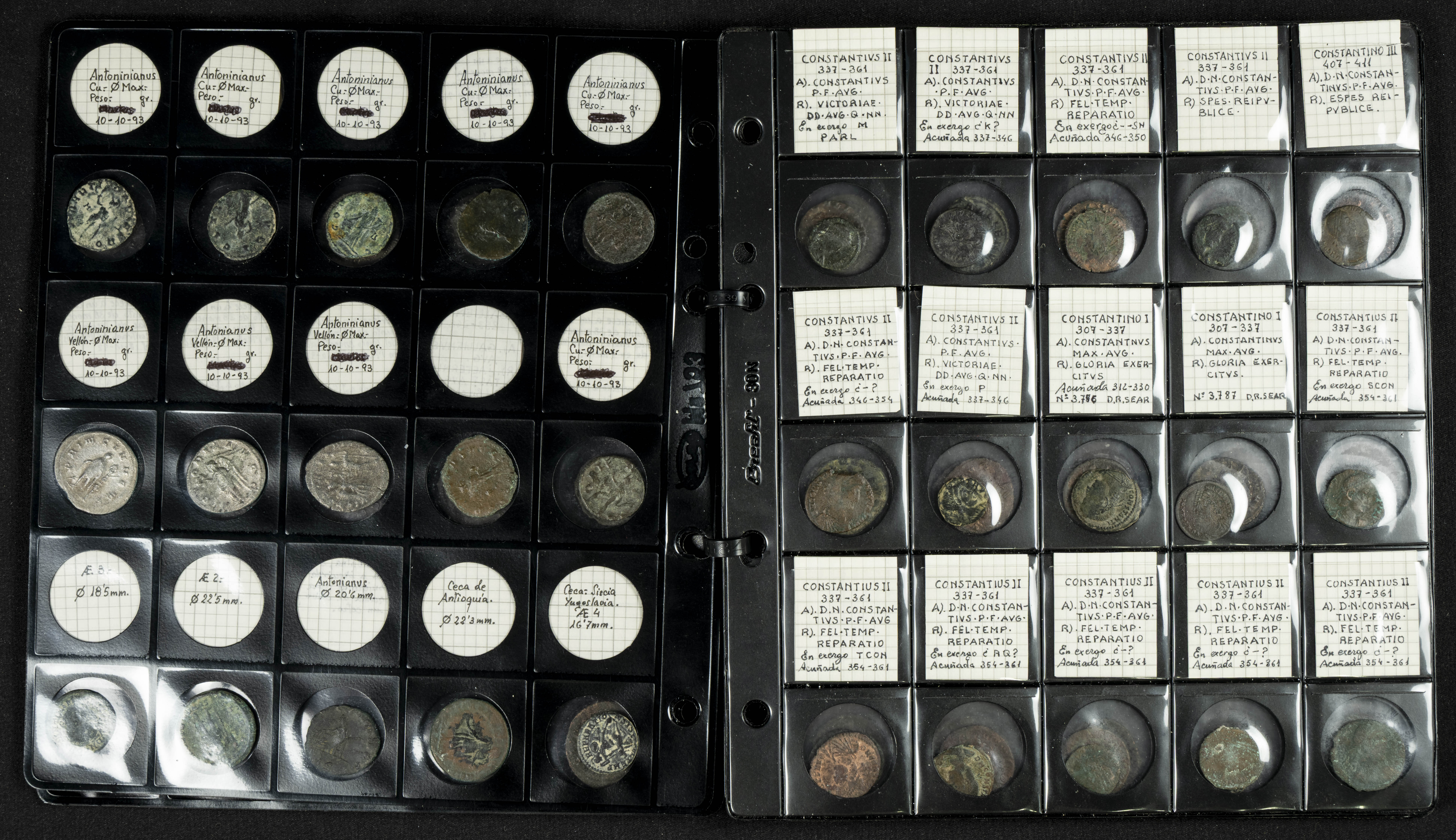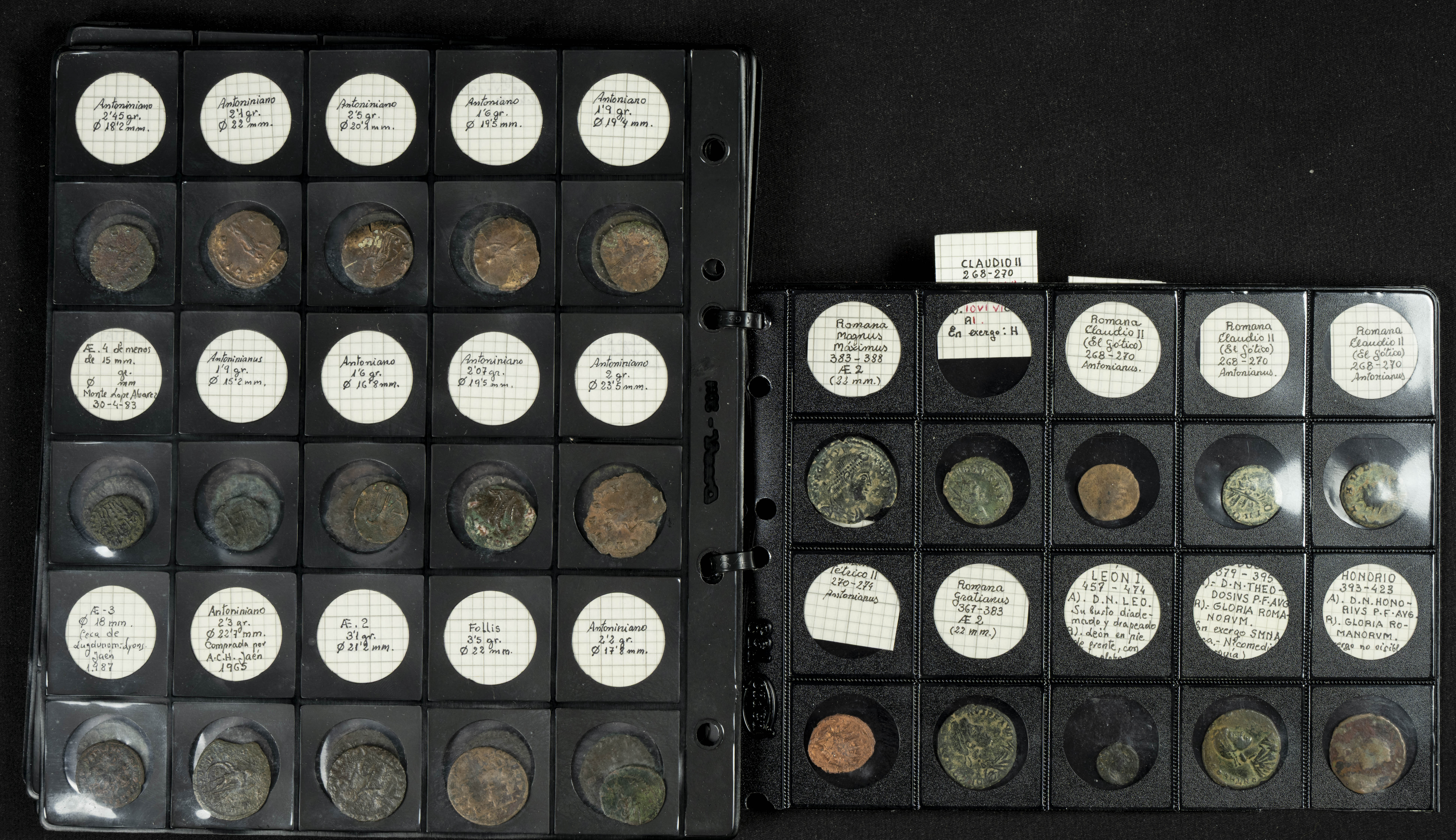 IMPERIO ROMANO. Interesantísima colección antigua compuesta por 100 bonitas acuñaciones de bajo imperio a nombre de los emperadores y emperatrices: Valeriano I, Galieno, Salonina, Valeriano II, Claudio II, Quintilo, Tetrico I, Diocleciano, Maximiano, Constantino I, Constantino II, Graciano, Teodosio I, Honorio, León I. A destacar una llamativa y organizada disposición del conjunto de piezas que van acompañas con cartoncillos de época descriptivos de cada una de ellas. Diferentes metales, módulos, cecas, reversos y estados de conservación. A EXAMINAR.