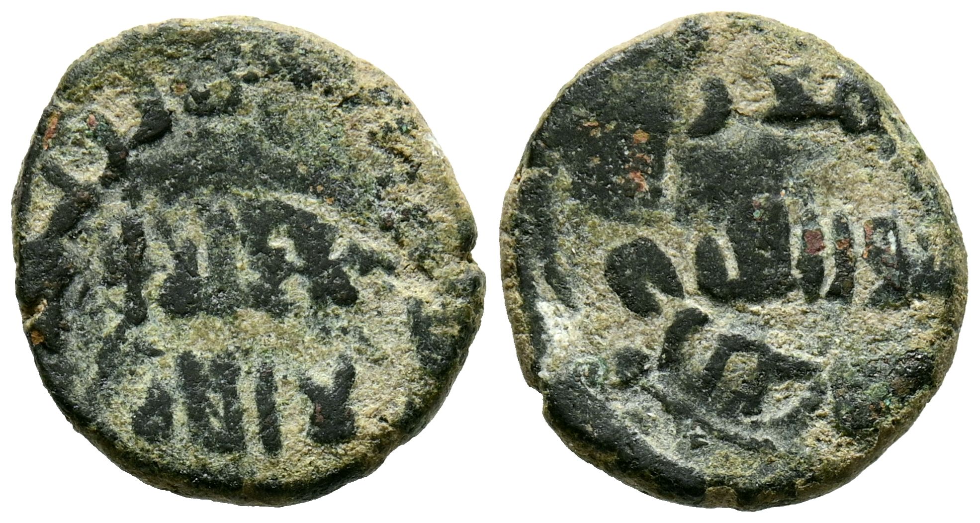 EMIRATO DEPENDIENTE DE CÓRDOBA, PERIODO DE GOBERNADORES. Anónimo. Felús. (Ae. 2,24g/14mm). S/D. al-Ándalus / الاندلس. (Vives 41; Frochoso XVIII-e). Anv: لاالله/ لااله ا. Rev: رسواالله / محمد. Rev: Orla parcialmente visible en ambas áreas. MBC+. Escas a.