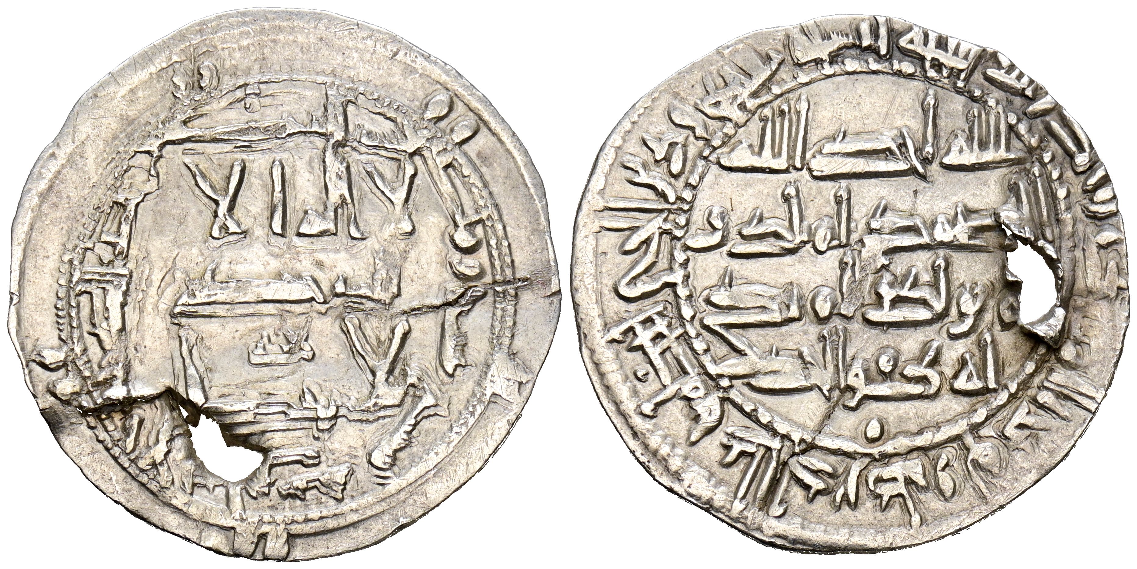EMIRATO INDEPENDIENTE DE CÓRDOBA. Abd al-Rahman II. Dirham. (Ar. 2,60g/26mm). 219H. al-Ándalus / الاندلس. (Vives 154; Frochoso 219.4). MBC-. Perforación.