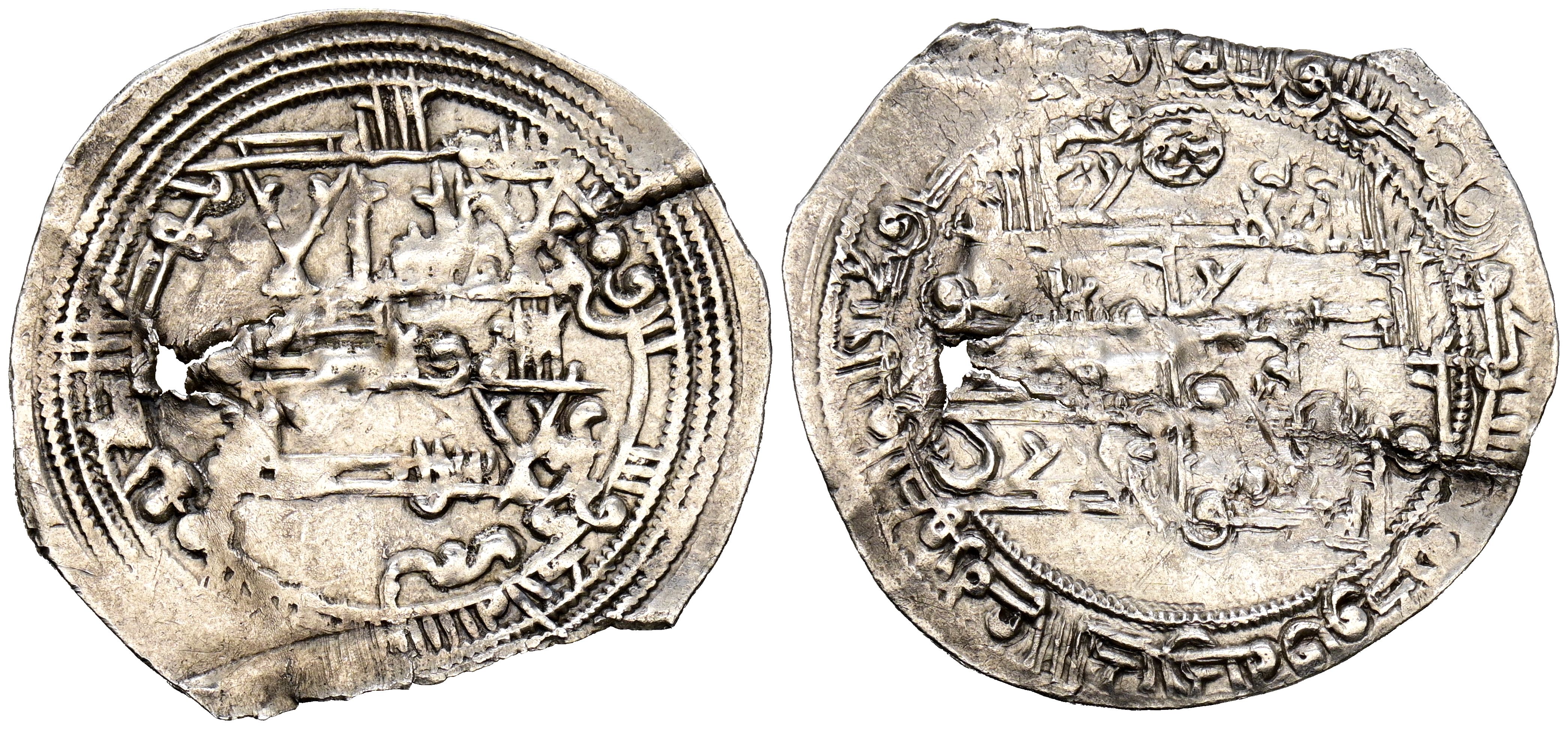 EMIRATO INDEPENDIENTE DE CÓRDOBA. Muhammad I. Dirham. (Ar. 2,39g/30mm). 261H. al-Ándalus / الاندلس. (Vives 285; Frochoso 261.13). MBC-. Grieta y falta en cospel.