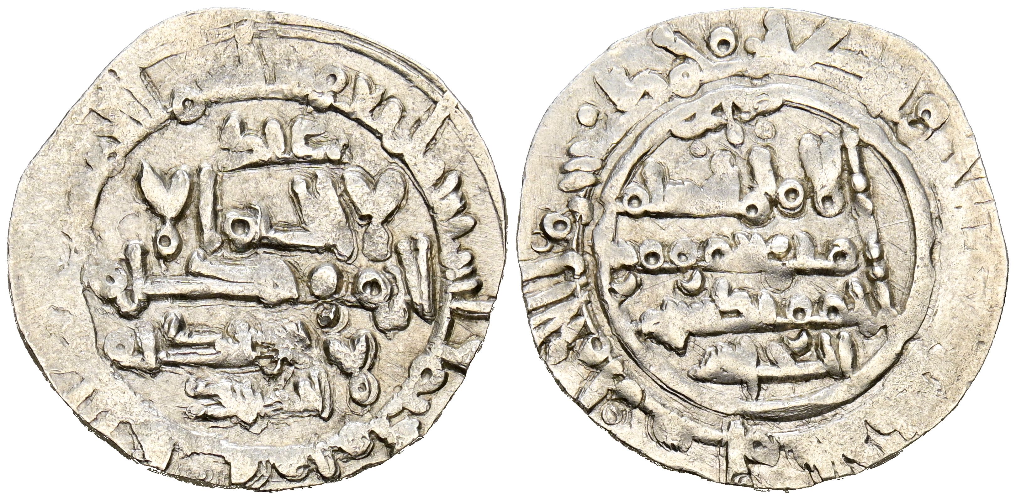 CALIFATO DE CÓRDOBA, Hisham II. Dirham. (Ar. 2,74g/23mm). 394H. Madinat Fas (Fez) / مدينة فاس. (Vives 636). Citando a 'Abd al-Malik / عبد الملك en IA. dividido y al-Hāŷib / الحاجب en IIA. MBC. Escasa.
