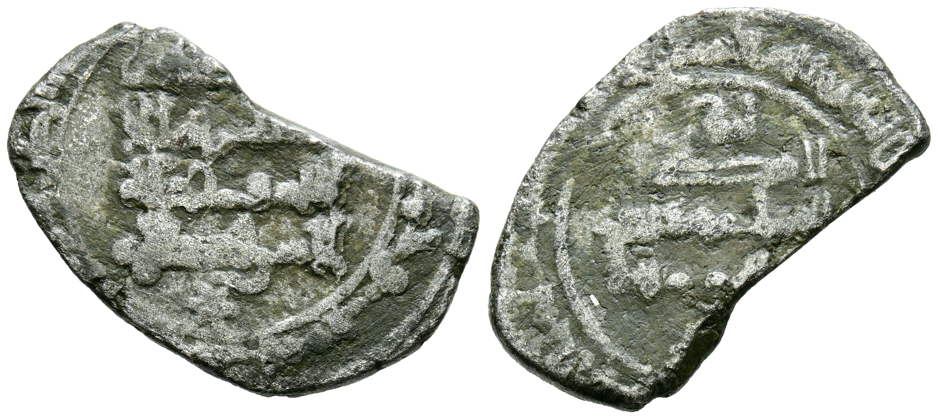 TAIFAS DEL CALIFATO, VALENCIA ('Amiries). Abd Al-Malik, Al Muzaffar. Fracción de dirham. (Ve. 2,59g/22mm). 456H. Balansiya (Valencia) / بلنسية. (Vives 1077; Prieto 166a; Francés 121-122). MBC-. Fracción de un 70%. Muy escasa.