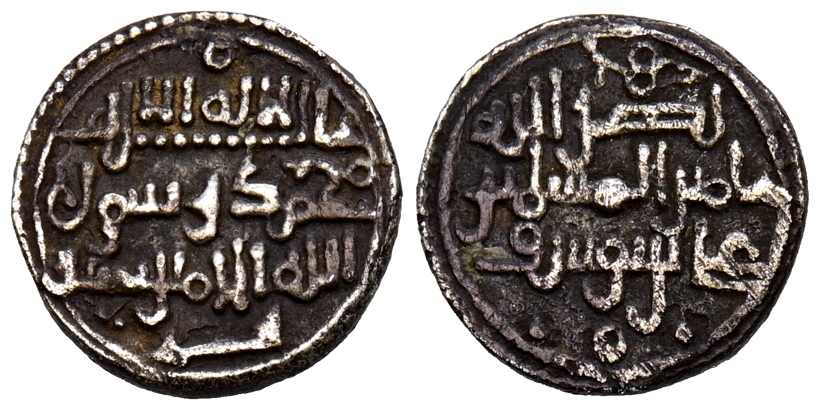 ALMORÁVIDES, Ali ben Yusuf y el Emir Sir (522-533H). Quirate. (Ar. 0,86g/11mm). S/D. (Vives 1773; Hazard 980; Benito Ce4). Anv: 'Shahada' en tres líneas, debajo cita al heredero: الامير سير. Rev: Presenta a Ali con títulos de Amir al-Muslimin, arriba el título de: بصر الله(Nars Allah). MBC+. Escasa.