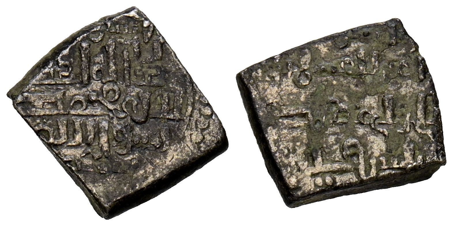ALMORÁVIDES, Ali ibn Yusuf y el Amir Tashfin (533-537H). Fracción de dirham. (Ar. 0,84g/9mm). Atribuído a Jaén. (Francés, MANQUSO 10, página 27, nº 7). Citando a un deconocido personaje: سعد (Sacd) en ambas áreas. MBC+. Muy rara.