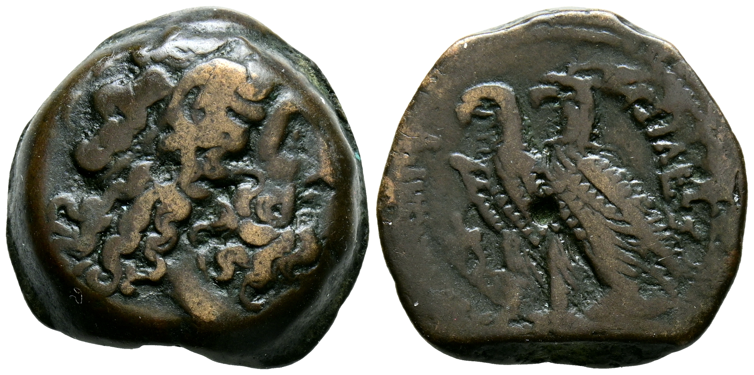 REINO PTOLEMAICO, Ptolomeo VI Filometor. Ae20. (Ae. 9,10g/20mm). 204-180 a.C. Alejandría. (Svoronos 1425; SNG Copenhaguen 308). Anv: Cabeza de Zeus-Ammon diademada a la derecha. Rev: Dos águilas de pie a la izquierda sobre rayo y cornucopia a la izqu ierda, alrededor leyenda griega: ΠΤΟΛΕΜΑΙΟΥ ΒΑΣΙΛΕΩΣ. MBC.