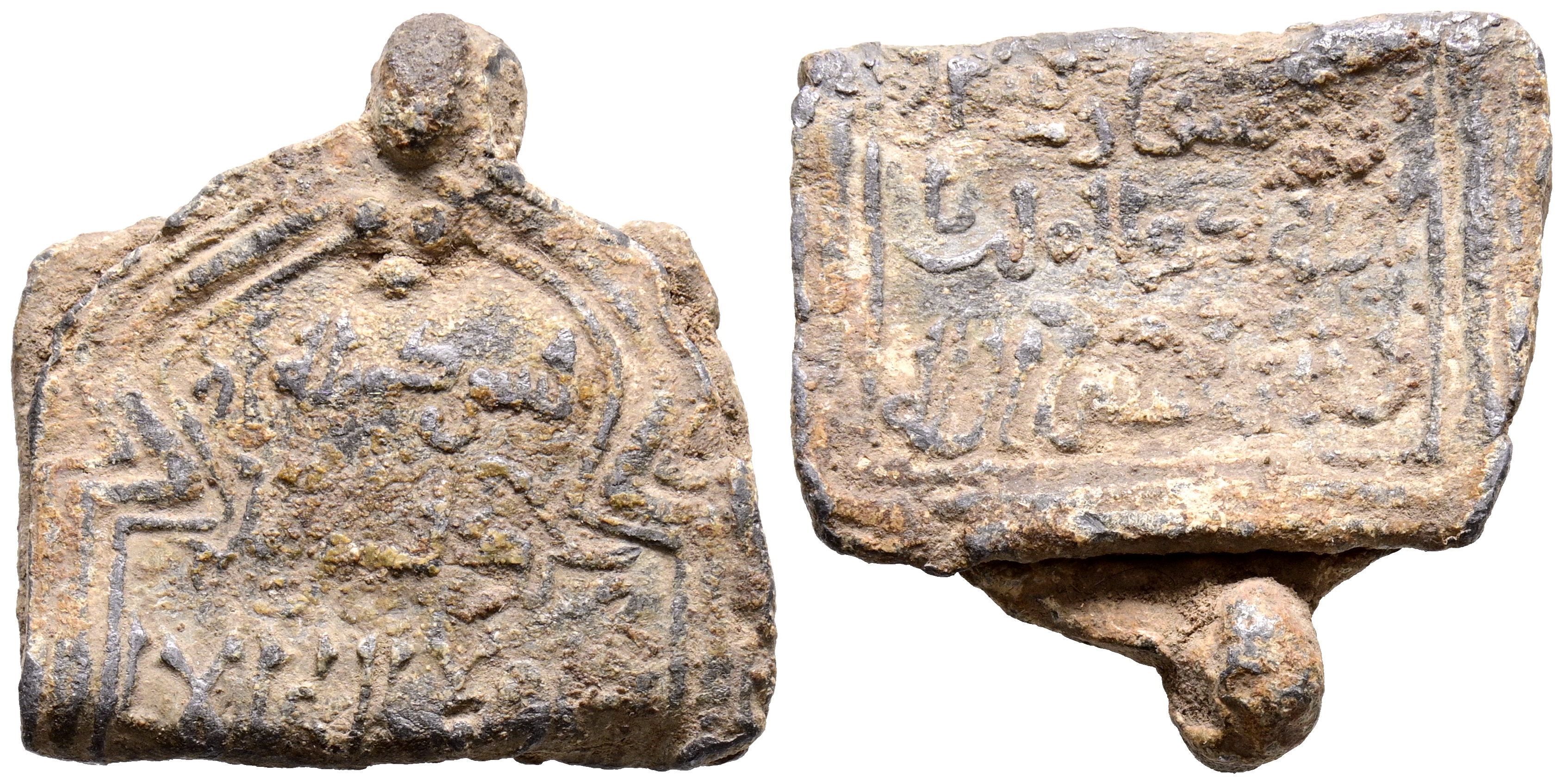 PERIODO CALIFAL O POSTERIOR. Amuleto de Mihrab". (Pb. 8,64g/23mm). Posiblemente Siglo X-XII. Posiblemente Siglo X-XII. Placa rectangular de plomo plegada en forma de diptico con un elemento de suspensión en el bode superior. Amuleto de los denominados "de mihrab", presenta en su parte visible siete lineas de escritura cúfica elegante. MBC+. Inédito.