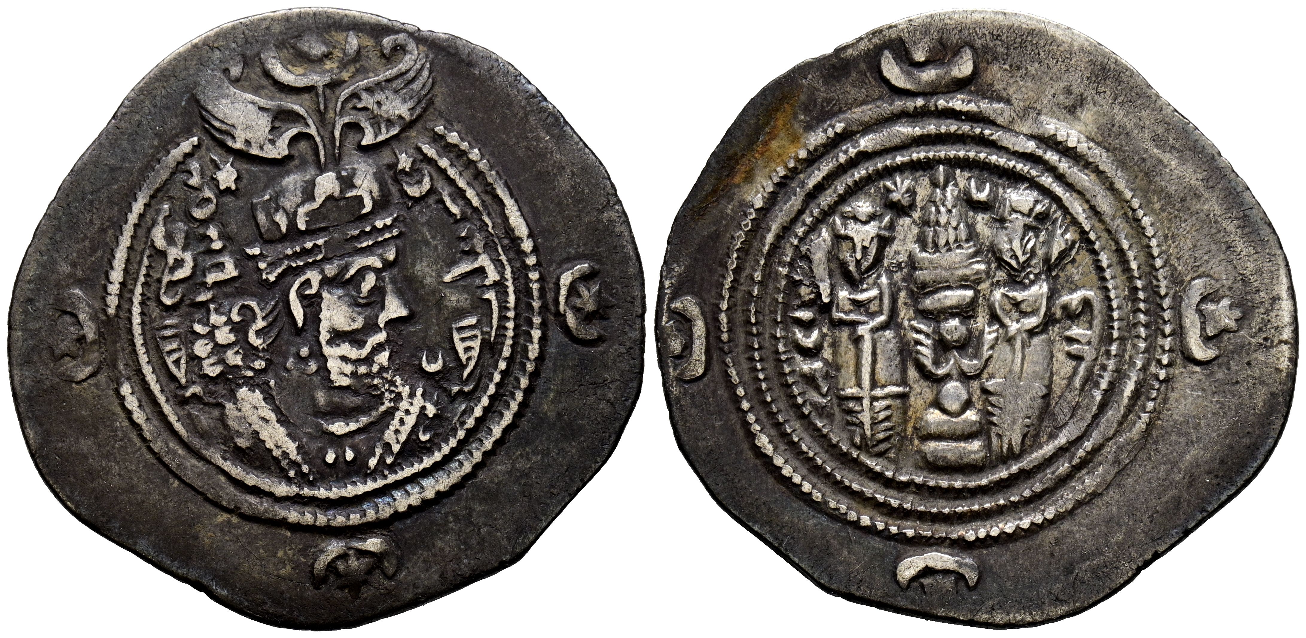 IMPERIO SASANIDA, Khusro II. Dracma. (Ar. 3,99g/31mm). Año 35 (624-5 d.C.). DA (Darabgird). (Göbl-II/3). Anv: Busto coronado y drapeado de Khusro II a derecha, alrededor leyenda en palavhi, todo dentro de una doble gráfila circular. En el exterior, a las 3h, 6h y 9h, creciente y estrella. Rev: Altar de fuego flanqueado por dos sacerdotes, a la derecha ceca: DA (Darabgird), y a izquierda año de acuñación: 35 (de reinado) dentro de 3 orlas, en el exterior, a las 12h, 3h, 6h y 9h creciente y estrella. MBC/MBC+.