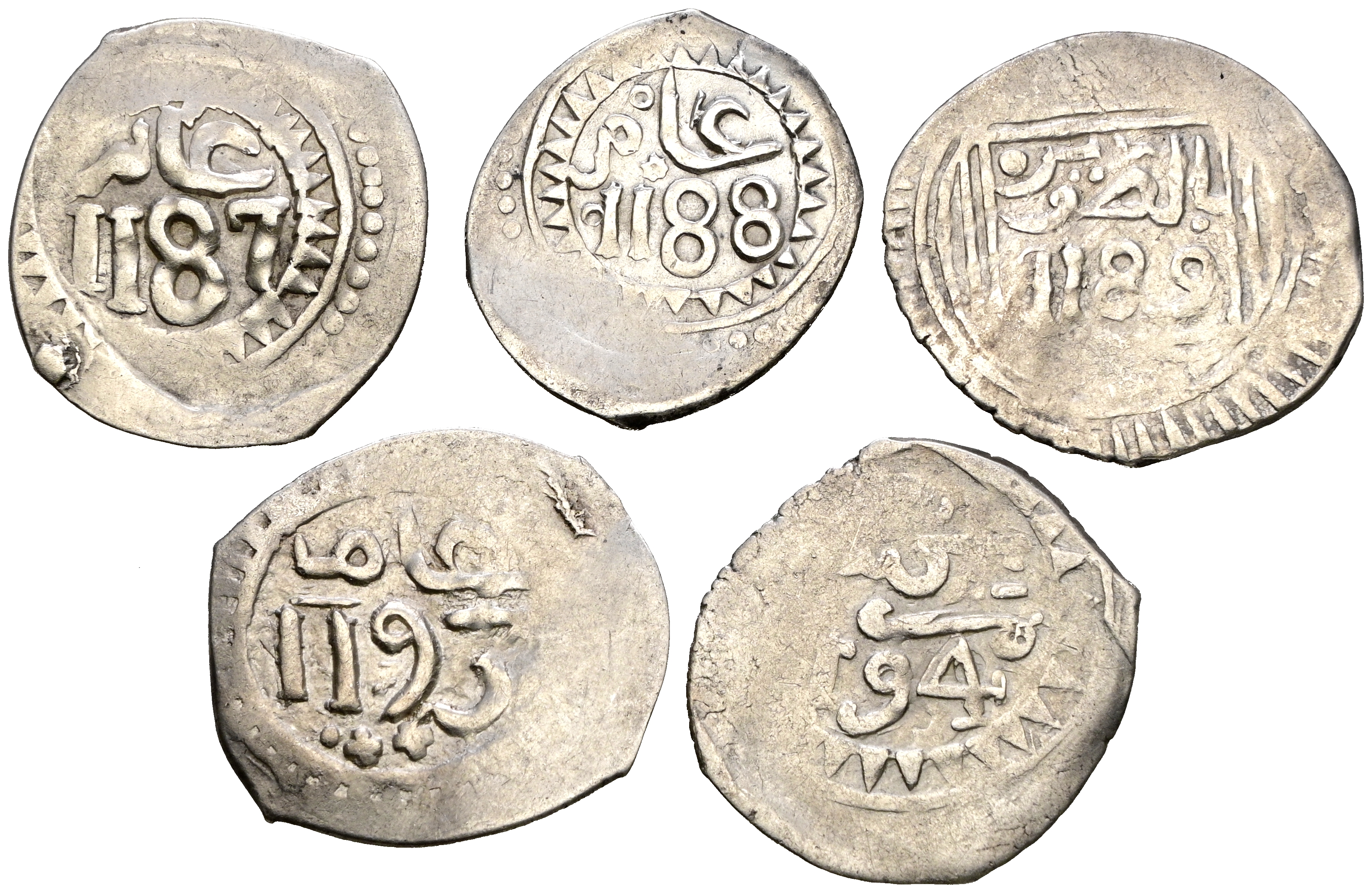 ALAUÍES. Interesante conjunto formado por 5 dirham acuñados durante el reinado de Sidi Mohammed III. A destacar la variedad de fechas (1187H, 1188H, 1189H, 1193H y 1194H) y algunos con ceca 'Mogador' y al-Suwayra. Diferentes medidas y estados de con servación. A EXAMINAR.