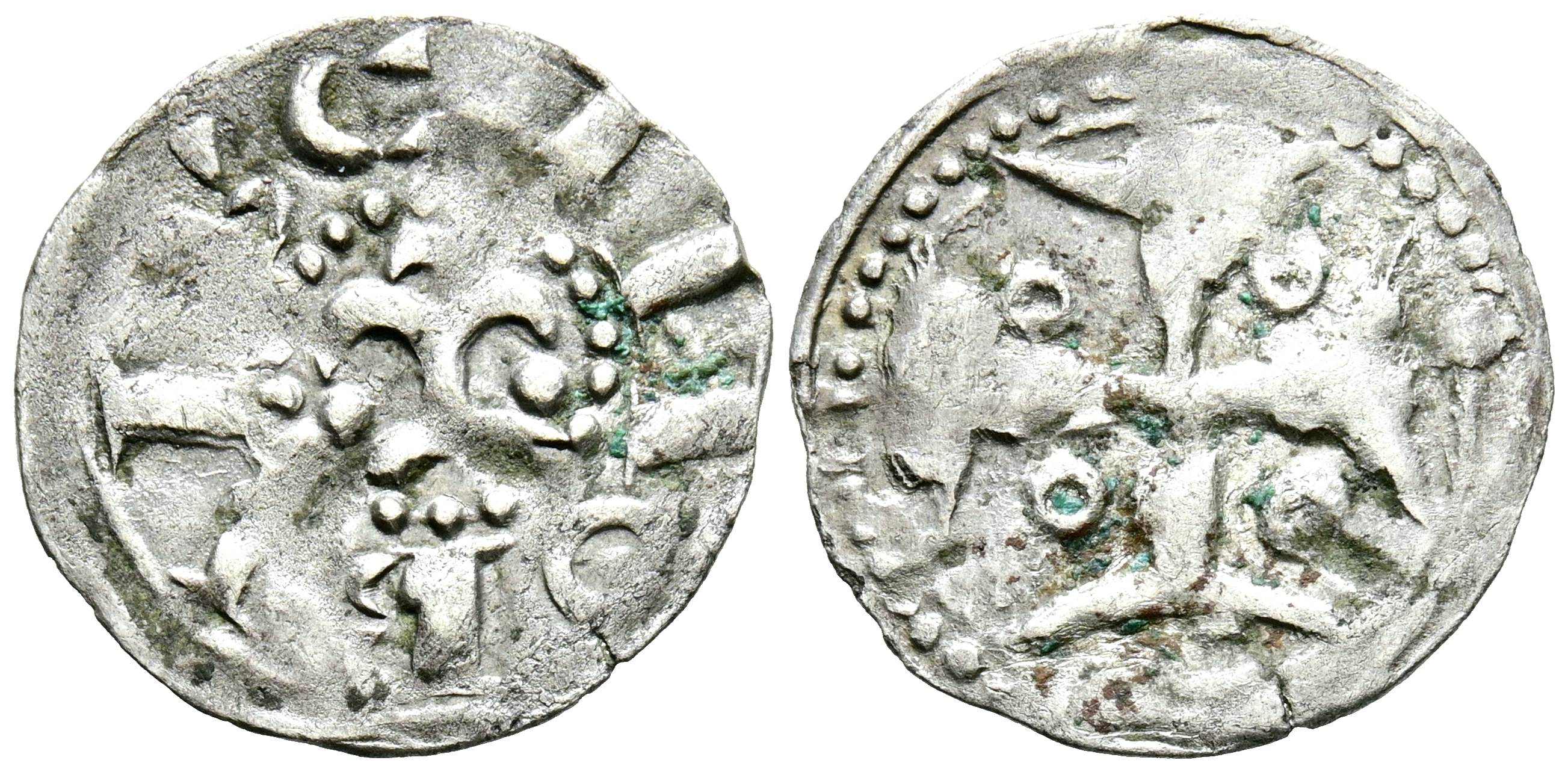 RAMON BERENGUER IV (1131-1162). Comensal. (Ve. 0,74g/18mm). Condado de Barcelona. (Cru C.G. 1846; Cru V.S. 33). Anv: Lirio dentro de grafila circular de puntos, alrededor leyenda retrograda: BARCINO. Rev: Cruz patada con anillos en los cuarteles rodeada de gráfila de puntos. MBC+. Escasa.