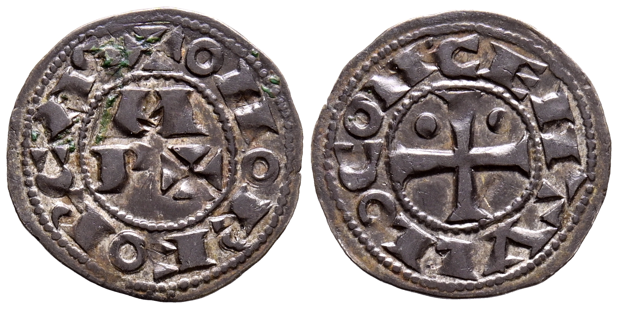 VIZCONDADO DE BEARN, a nombre de Centul (1150-1240). Dinero. (Ve. 0,52g/15mm). Morlá. (Cru.V.S. 166). Anv: PAX dentro de orla de puntos, alrededor leyenda: ONORFORCAS. Rev: Cruz con puntos en 1º y 2º cuadrante, alrededor leyenda: CENTVLLOCOME. MBC+.