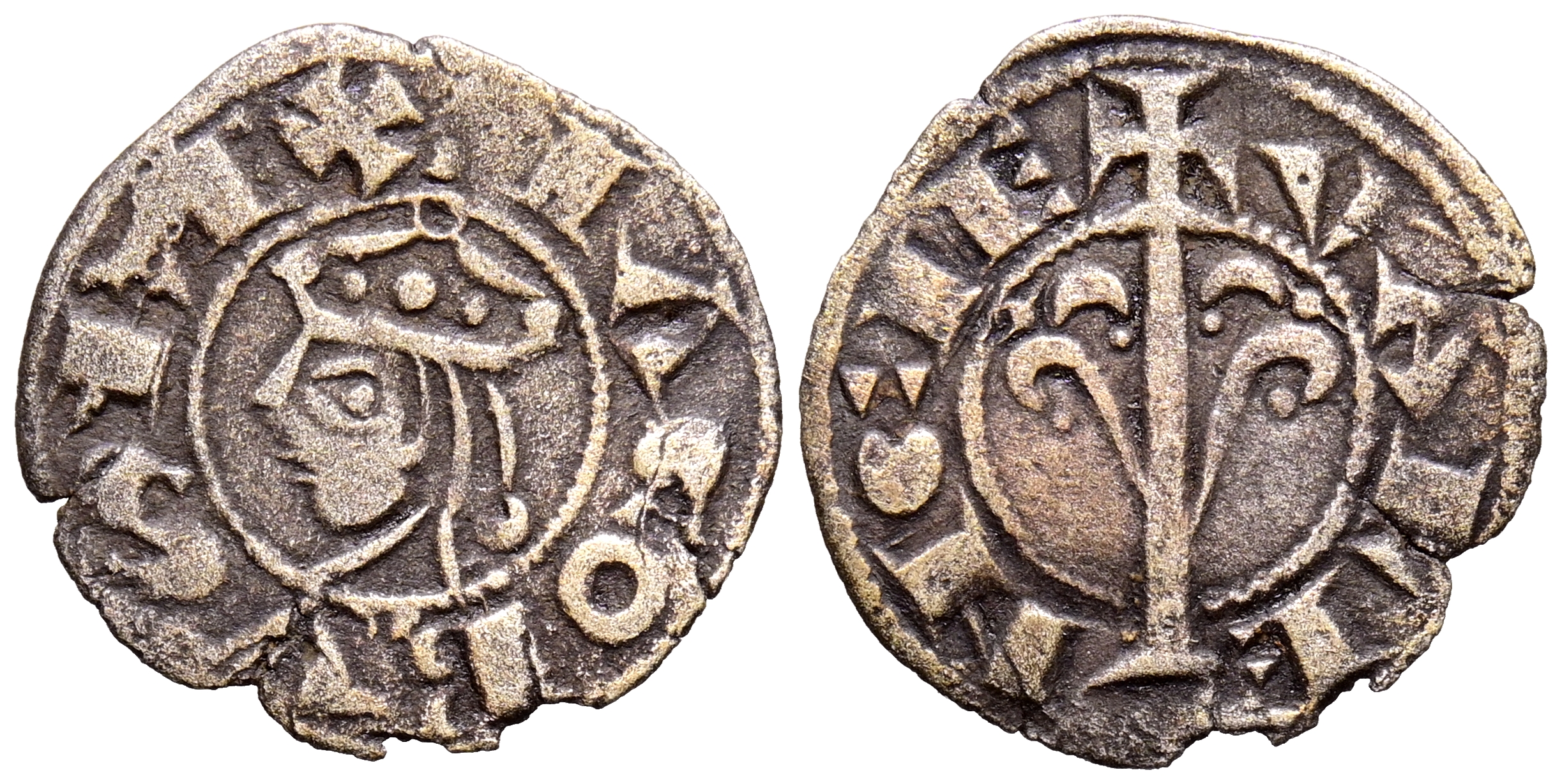JAIME I (1213-1276). Dinero. (Ve. 0,70g/17mm). Valencia. (Cru.V.S. 316). Anv: Busto coronado de Jaime I a izquierda dentro de una gráfila circular, alrededor leyenda: IACOBVS REX. Rev: Árbol superado de la cruz con ramas de implantación bajas dentro de una gráfila circular, alrededor leyenda: VALENCIE. MBC.
