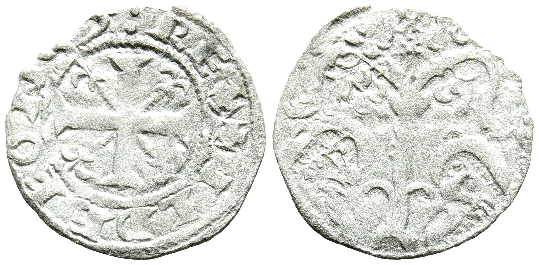 ALFONSO IX (1188-1230). Dinero. (Ve. 0,48g/16mm). Marca de ceca de creciente. (Imperatrix A9:1.16; FAB-144). Anv: Cruz patada con veros sobre vástagos en los cuarteles, alrededor leyenda: ILDEFONS REX. Rev: Arbol, entre dos leones enfrentados. MBC-. Pequeña falta en cospel.