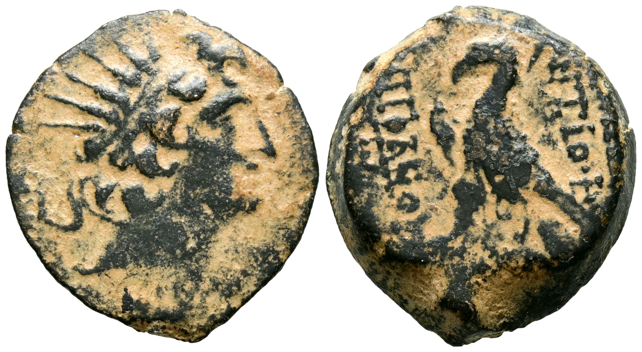 REINO SELEUCIDA, Antiochos VIII Epiphanes. Ae. (Ae. 5,66g/20mm). Antioquía. (HGC 9, 1212; Seaby 2300). Anv: Busto radiado de Antiochos VIII a derecha. Rev: Aguila estante sobre rayos a zquierda, alrededor leyenda griega: BAΣΙΛΕΩΣ ANTIOXOY EΠIΦANOYΣ. MBC.
