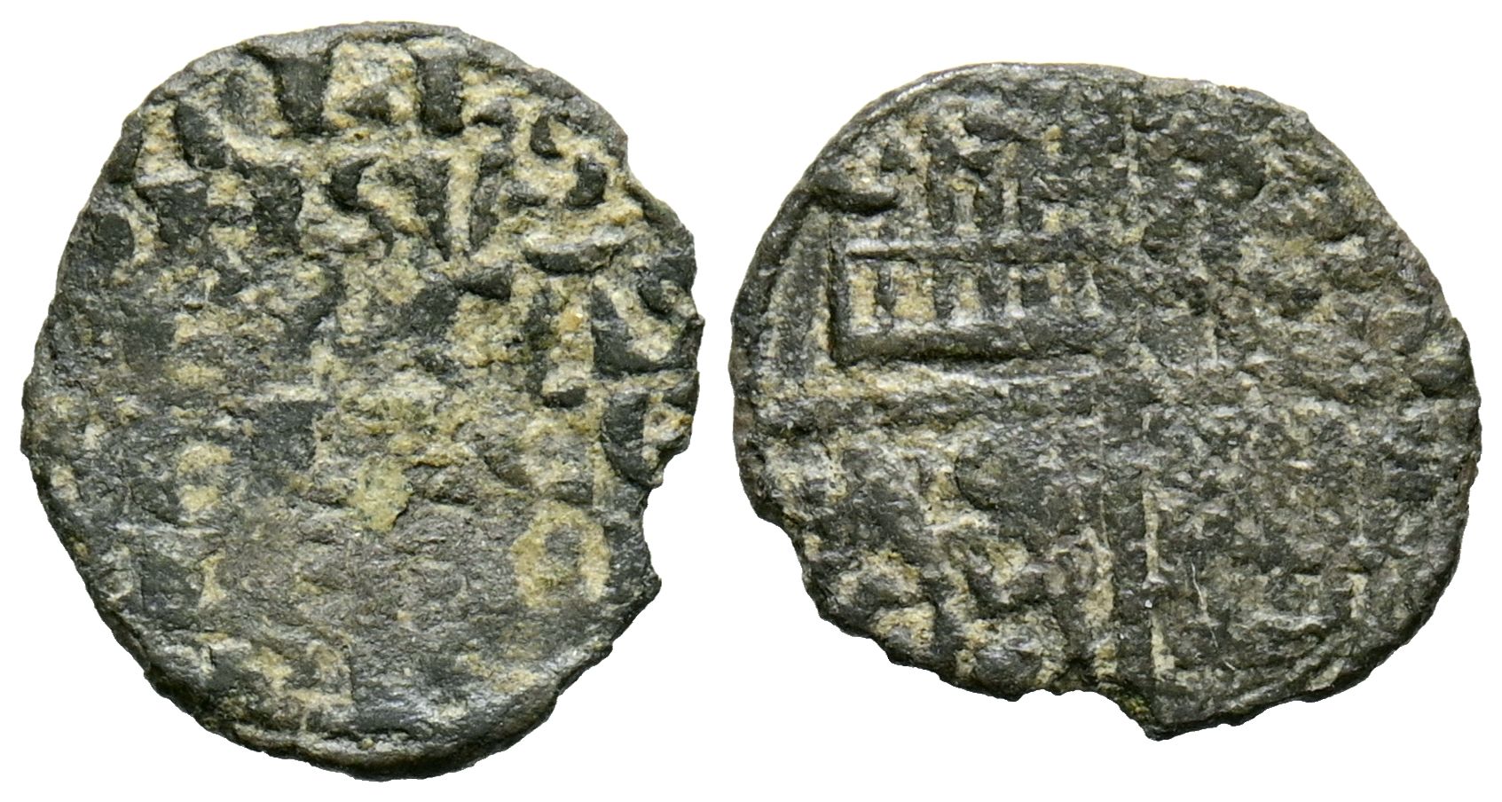 ALFONSO X (1252-1284). Meaja alfonsí "de la 1º guerra de Granada". (Ve. 0,34g/12mm). Sin ceca. (Imperatrix A10:5.1; FAB-247, como óbolo). Anv: Leyenda en seis líneas: ALF/ONSVS/REX CAS/TELLE E/T LEGIO/NIS. Rev: Cuartelado de castillos y leones. BC+.