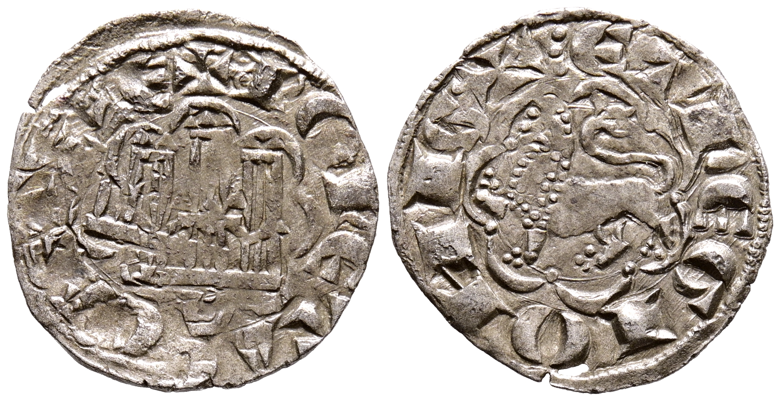 ALFONSO X (1252-1284). Blanca Alfonsí (de la 2º Guerra de Granada). (Ve. 0,81g/18mm). Burgos. (Imperatrix A10:11.6; FAB-263 como Novén). Anv: Castillo, debajo: B, dentro de gráfila lobular, alrededor leyenda: MONETA CASTELLE. Rev: León rampante a izquierda dentro de gráfila lobular, alrededor leyenda: ET LEGIONIS. MBC+.