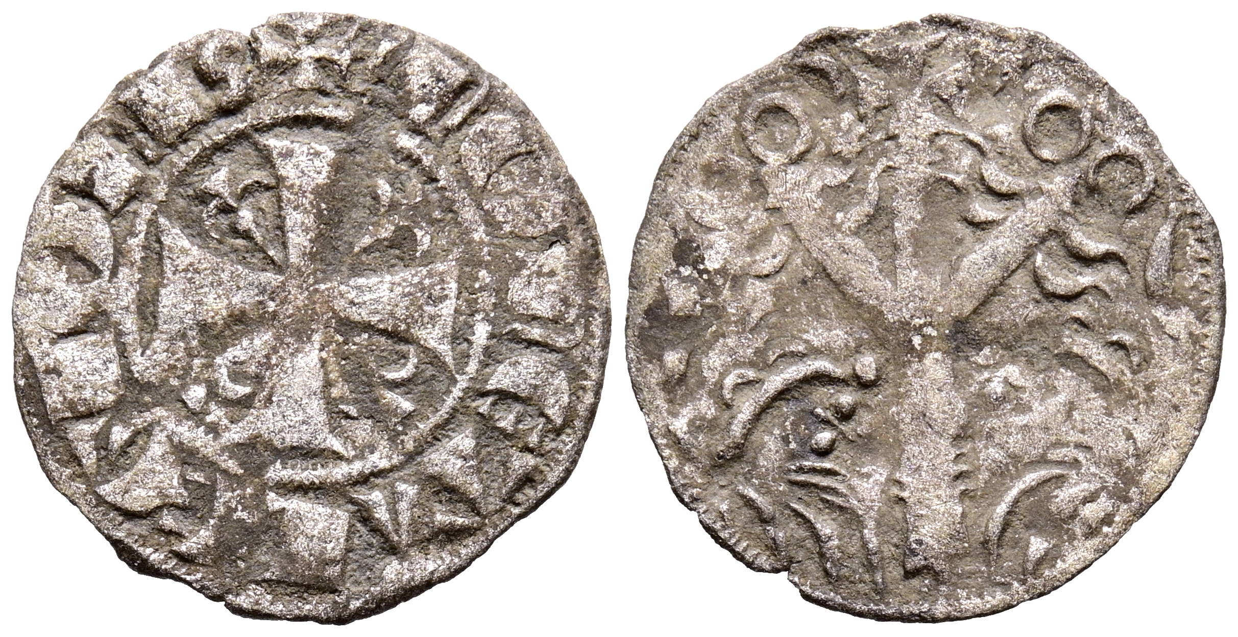 SANCHO IV (1282-1284). Dinero "Salamanques". (Ae. 0,65g/17mm). León. (Imperatrix S4:2.3 FAB-212, como Fernando III). Anv: Cruz potenzada con cuatro flores de lis unidas al centro por un vástago dentro de gráfila de puntos, alrededor leyenda: MONETA LEGIONIS. Rev: Dos leones lineales y punteados bajo árbol del Paraíso de aspecto espinado con base plana remata de cruz, a ambos los lados de la cruz dos crecientes laterales. MBC+.