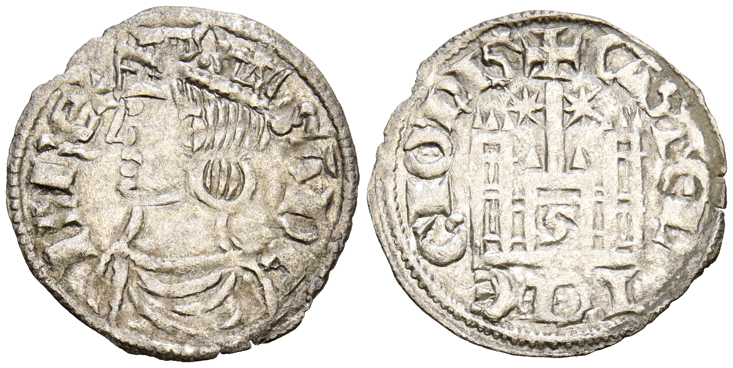 SANCHO IV (1284-1295). Cornado. (Ve. 0,72g/19mm). Sevilla. (Imperatrix CS4:3.33; FAB-301.2). Anv: Busto coronado de Sancho IV a izquierda, alrededor leyenda: SANCII REX. Rev: Castillo con cruz sobre vástago central entre estrellas y S en la puerta, alrededor leyenda: CASTELLE E LEGIONIS. MBC+.