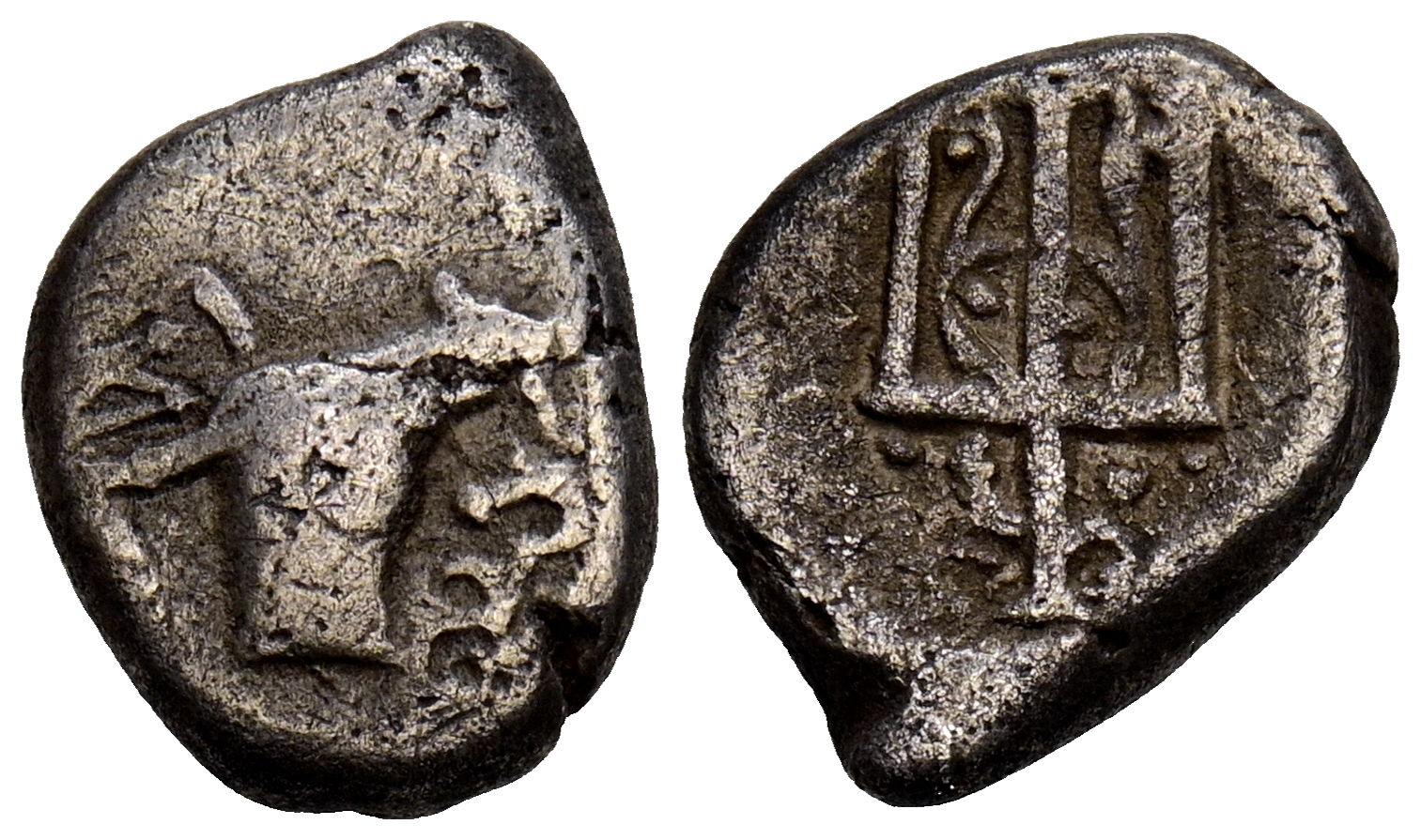 TRACIA, Bizancio. Hemidracma. (Ar. 1,63g/12mm). 387-340 a.C. (HGC 3.2, 1388). Anv: Parte delantera de vaca a izquierda, debajo delfín, encima de dos letras griegas. Rev: Tridente. MBC-.