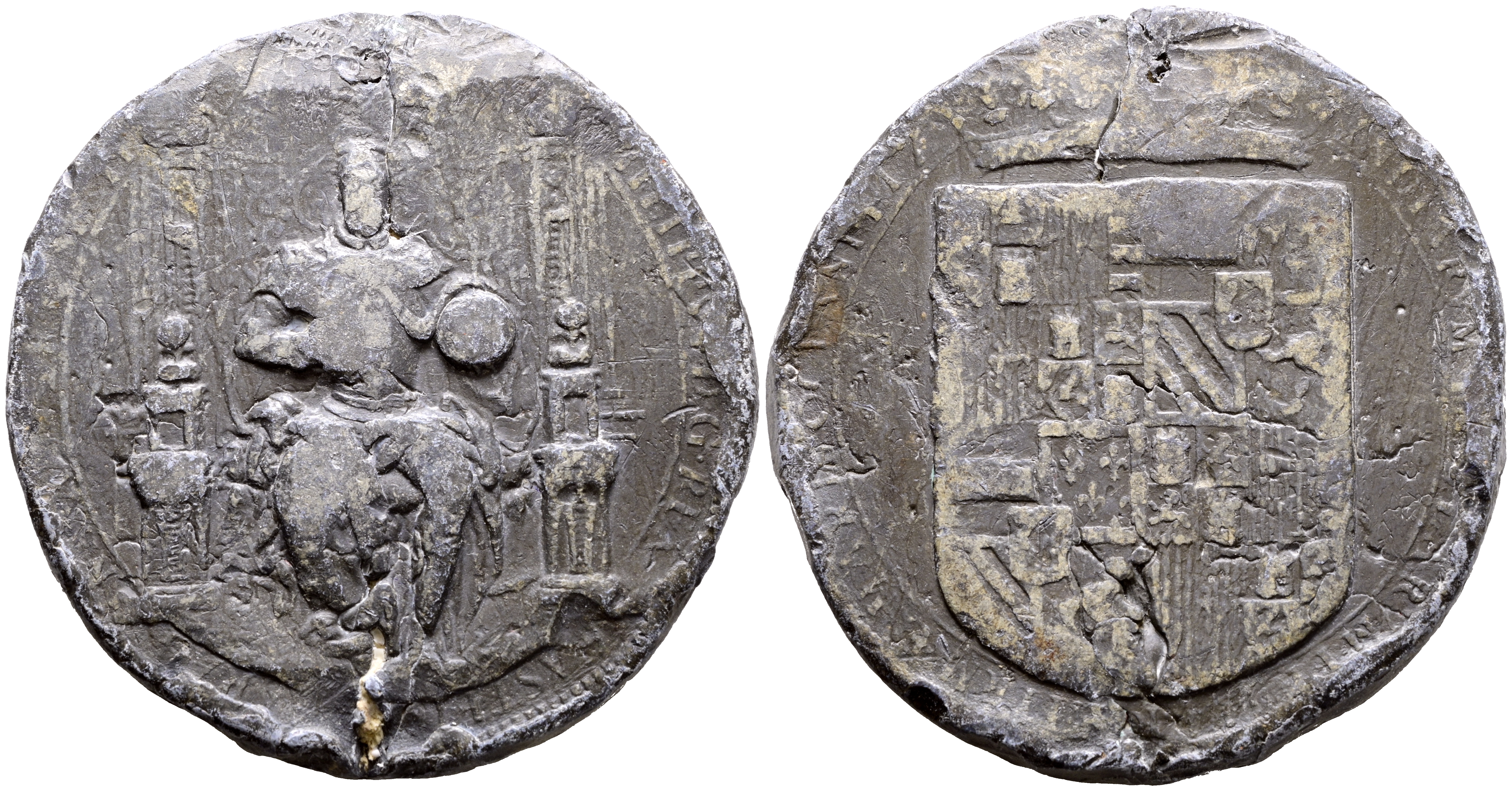 FELIPE II. Sello pendiente. (Pb. 380g/75mm). (Guglieri-636; FN-p. 126). Anv: Felipe II entronizado portando orbe y espada, alrededor leyenda: PHILIPPVS. D G REX CASTEL LEG ARAG NAVAR VTR Q SICIL. Rev: Escudo de armas coronado, alrededor leyenda: INDIARVM INSVLARVM ET TERRAE FIRMAE MARIS OCEANI ETC. BC+. Golpes en canto.Ex Jesús Vico, Subasta Online 18 (09/06/2022), Nº lote 481.
