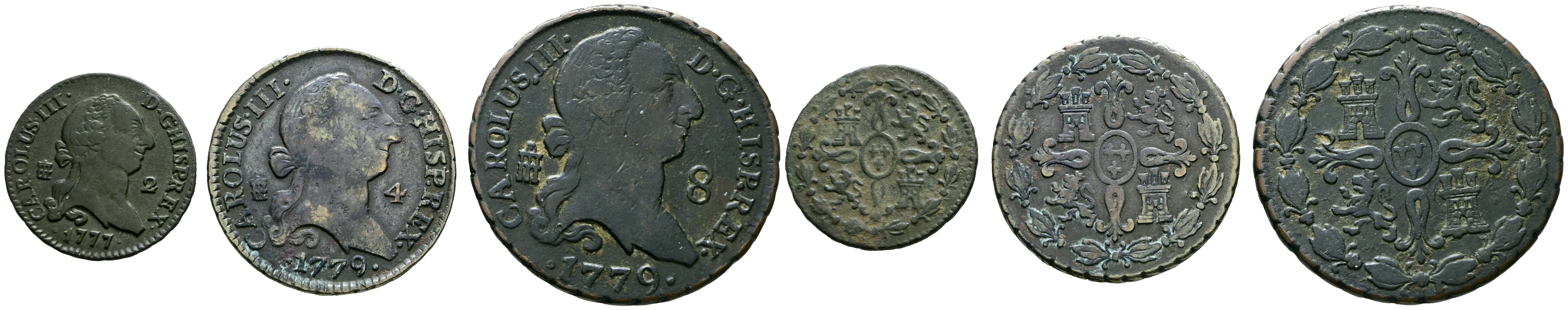 CARLOS III (1759-1788). Trío de cobres con valores de 2, 4 y 8 maravedís. 1777 y 1779. Segovia. Diferentes estados de conservación. A EXAMINAR.