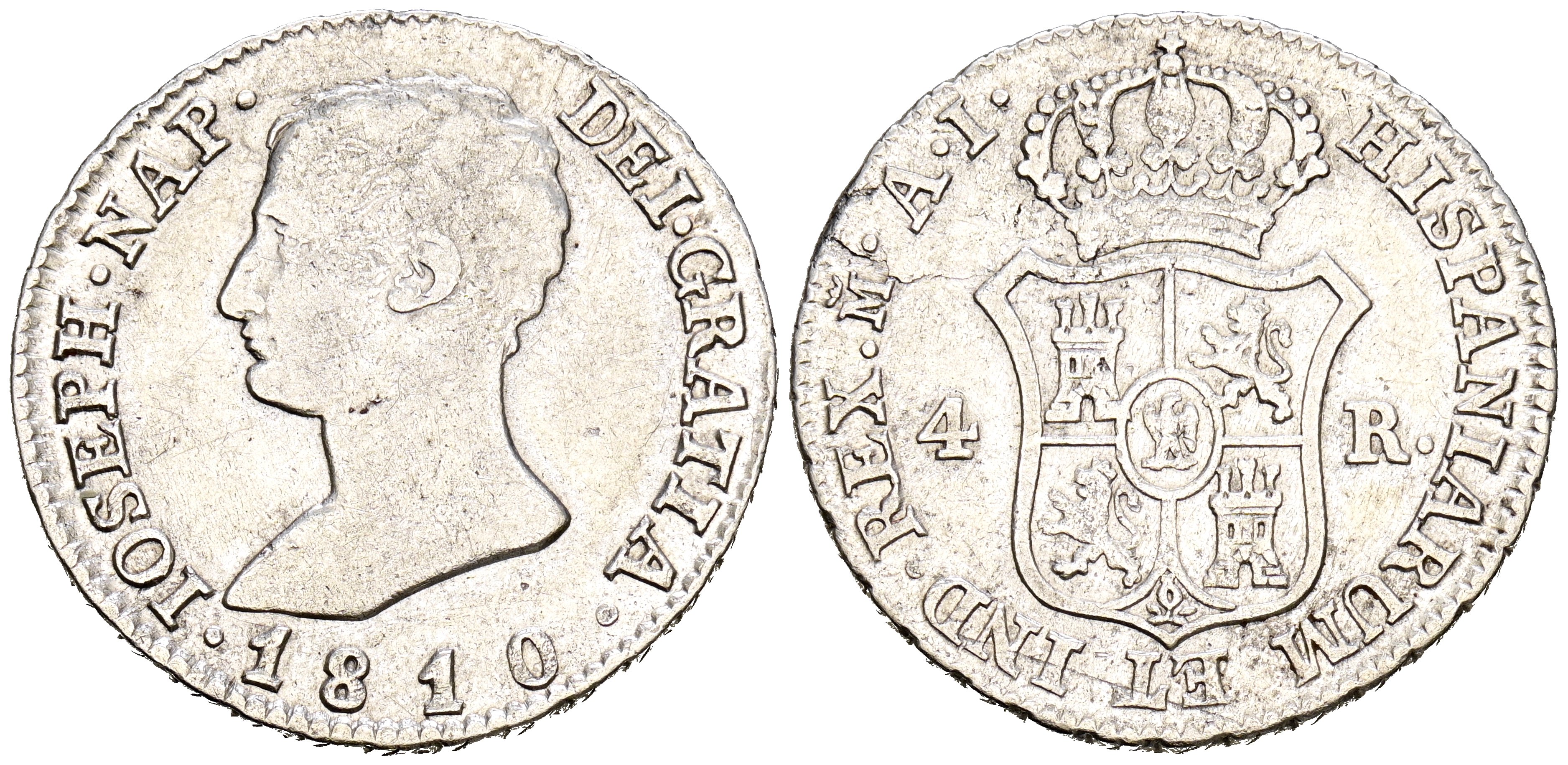 JOSÉ NAPOLEÓN (1808-1813). 4 Reales. (Ar. 5,97g/26mm). 1810. Madrid AI. (Cal-2019-14). MBC+. Leves restos de brillo original.