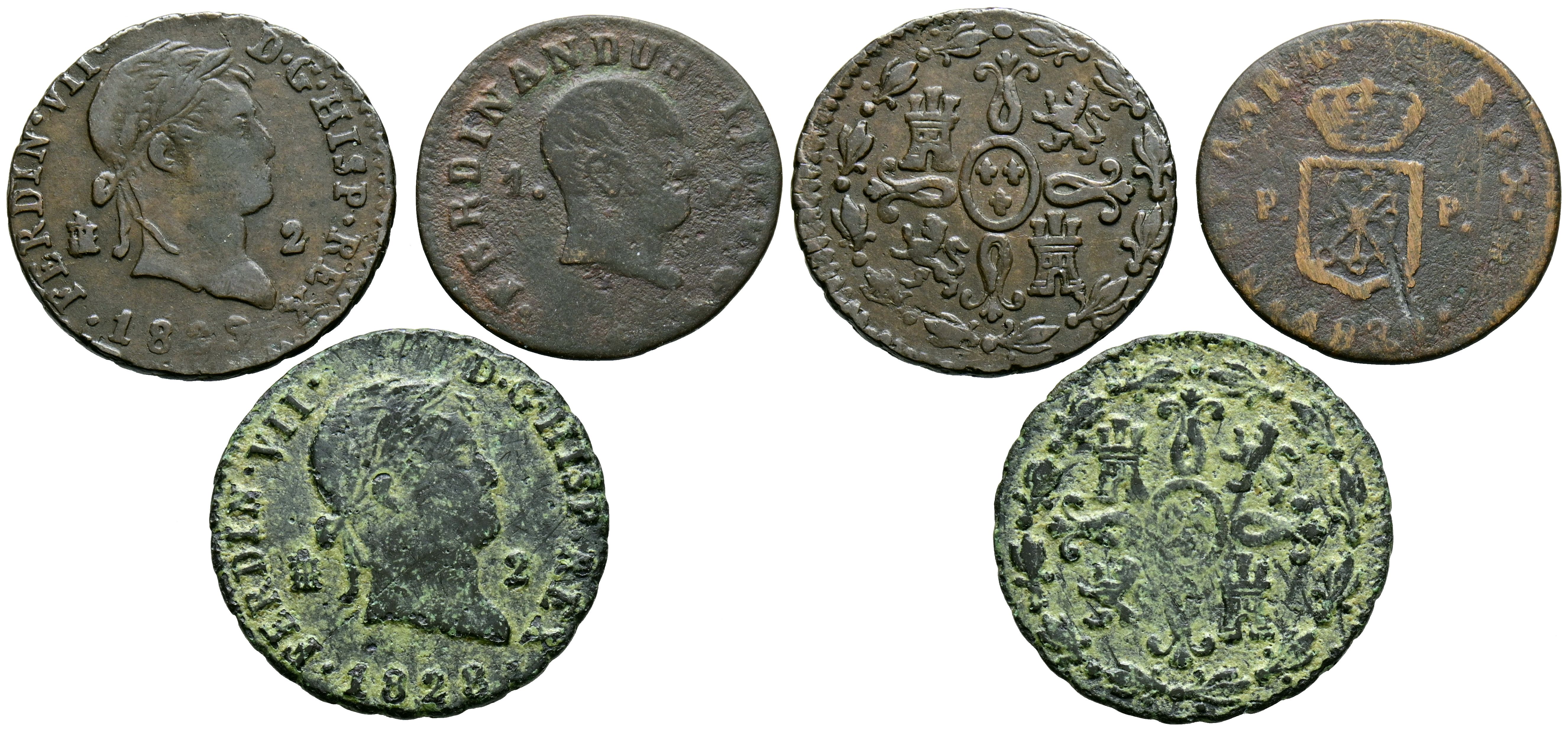 FERNANDO VII (1808-1833). Conjunto de 3 cobres pequeños, dos de ellos 2 Maravedís acuñados en Segovia y el otro 1 maravedí acuñado en Pamplona. A EXAMINAR.