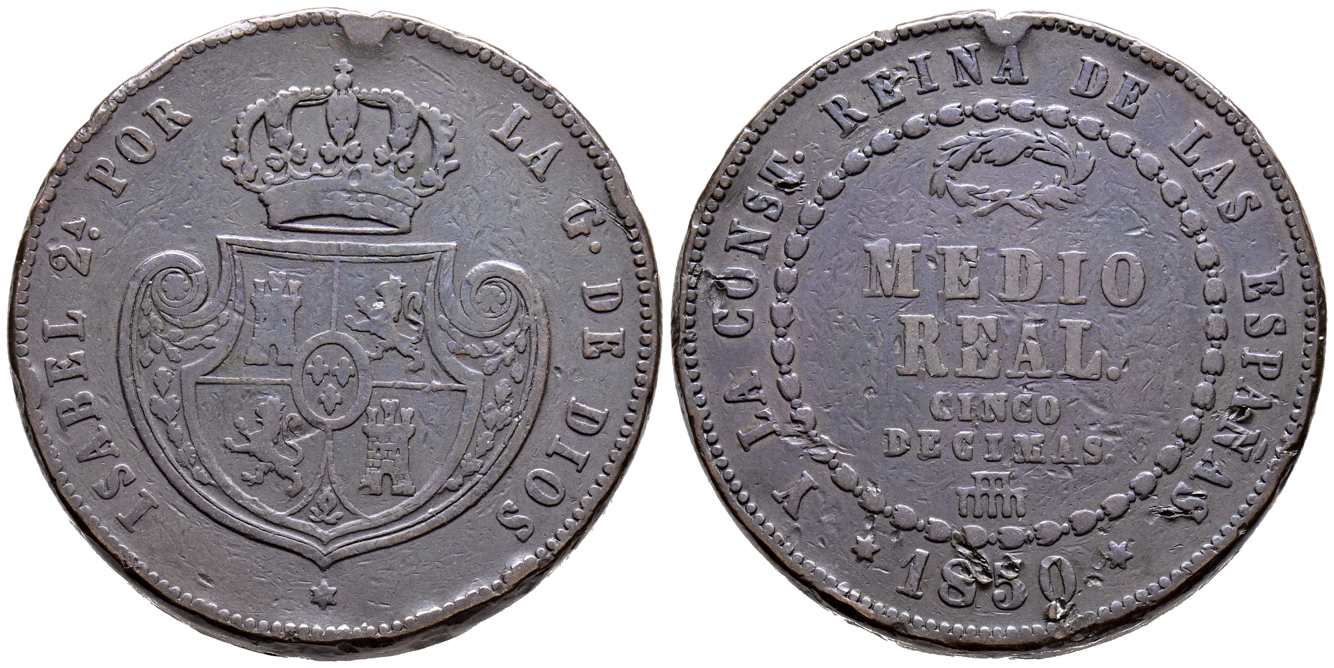 ISABEL II (1833-1868). 1/2 Real (5 Décimas). (Ae. 18,16g/32mm). 1850. Segovia. (Cal-2019-155). MBC-.