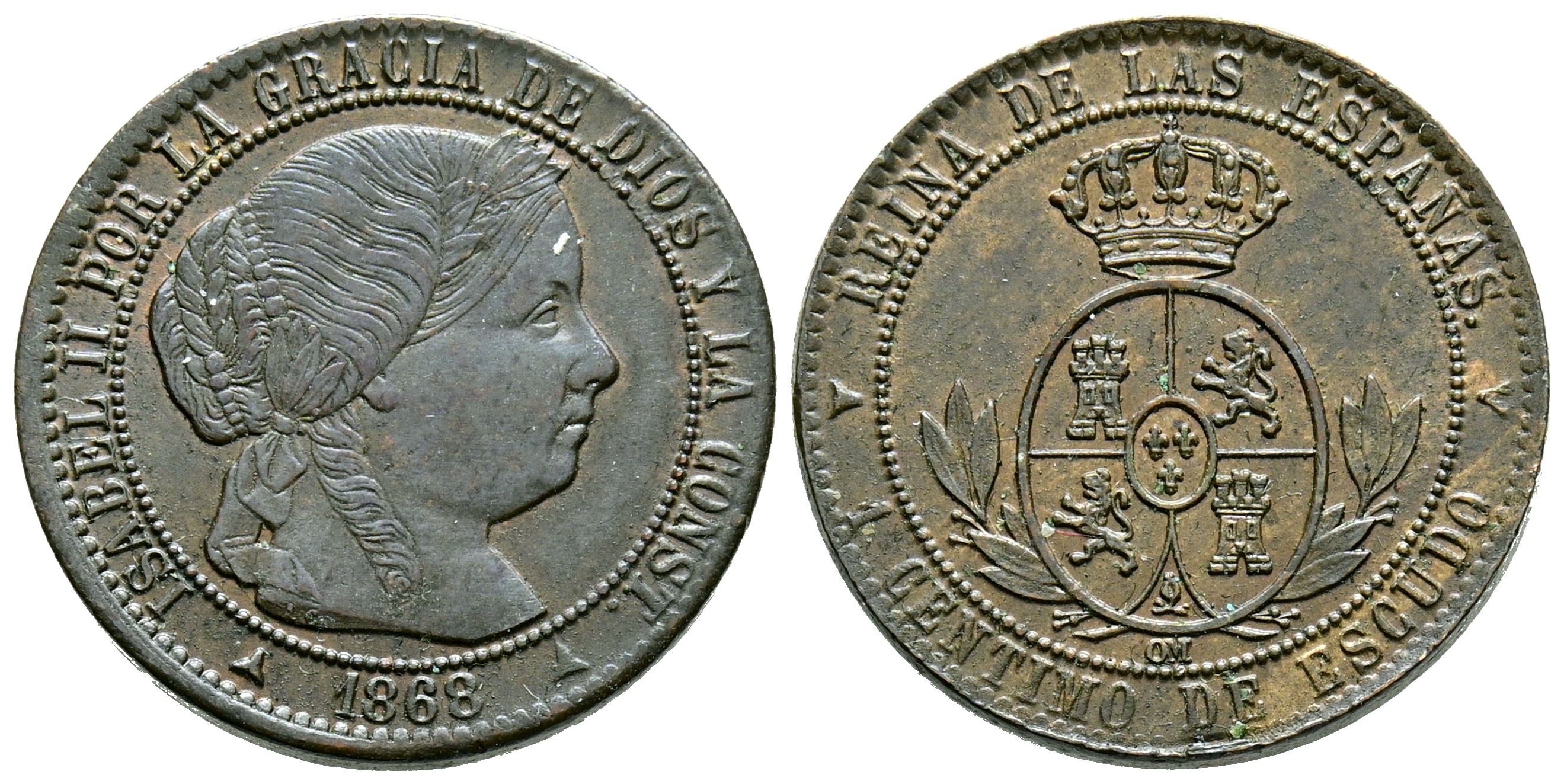 ISABEL II (1833-1868). 1 Céntimo de Escudo. (Ae. 2,44g/18mm). 1868. Segovia OM. (Cal-2019-227). MBC+.