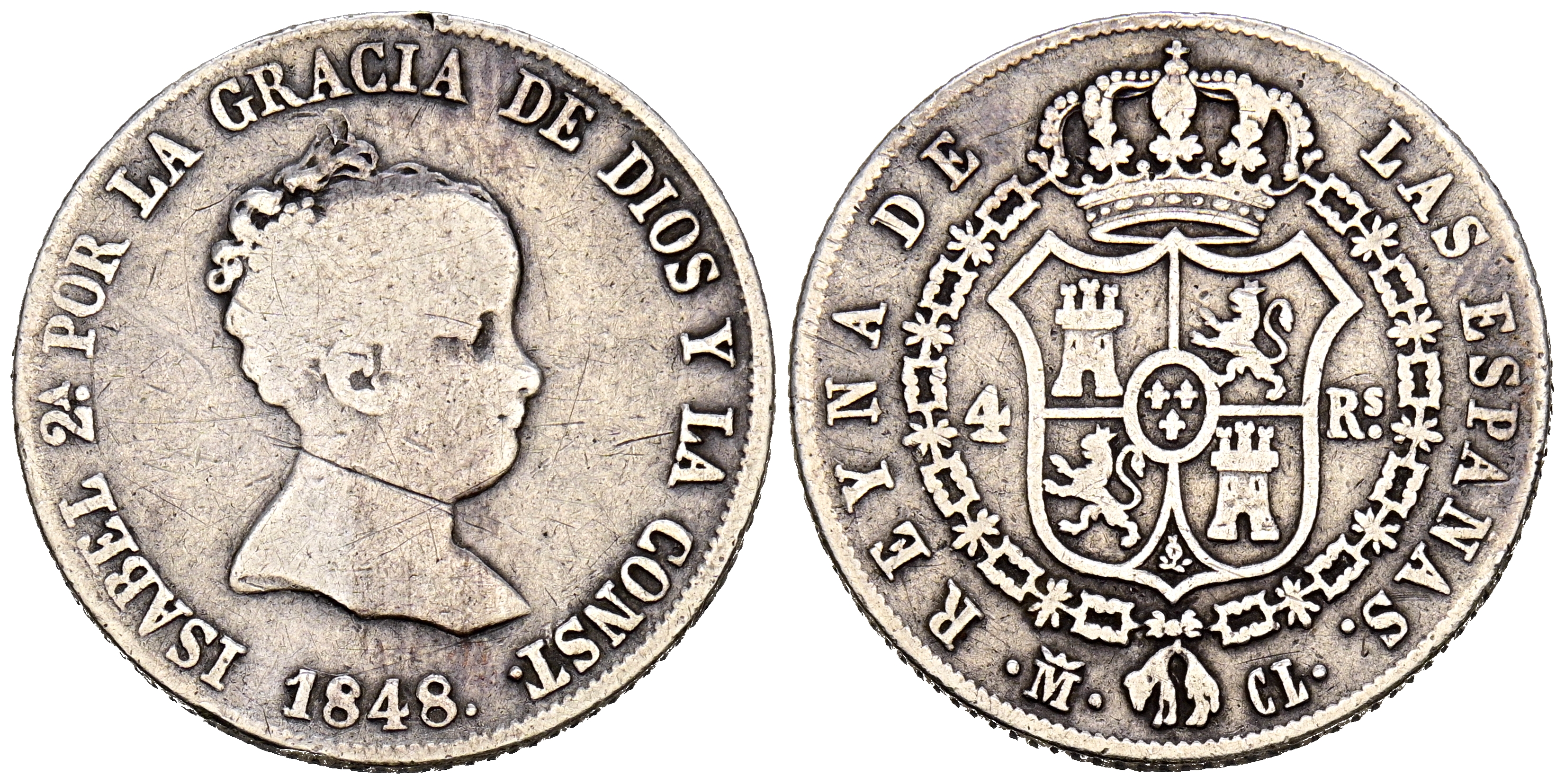 ISABEL II (1833-1868). 4 Reales. (Ar. 5,05g/23mm). 1848. Madrid CL. (Cal-2019-453). BC/MBC-.