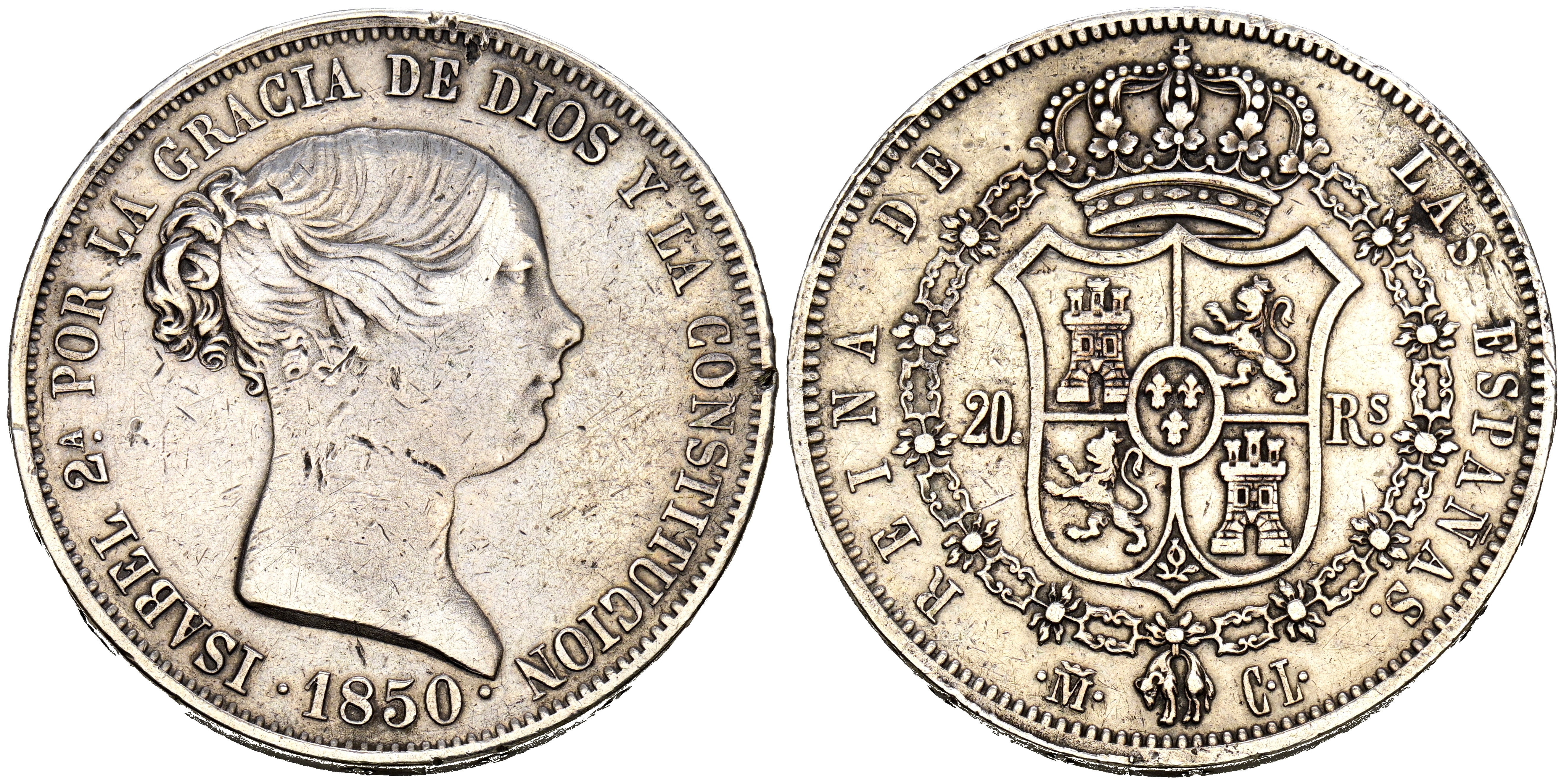 ISABEL II (1833-18368). 20 Reales. (Ar. 25,95g/37mm). 1850. Madrid CL. (Cal-2019-592). MBC-.