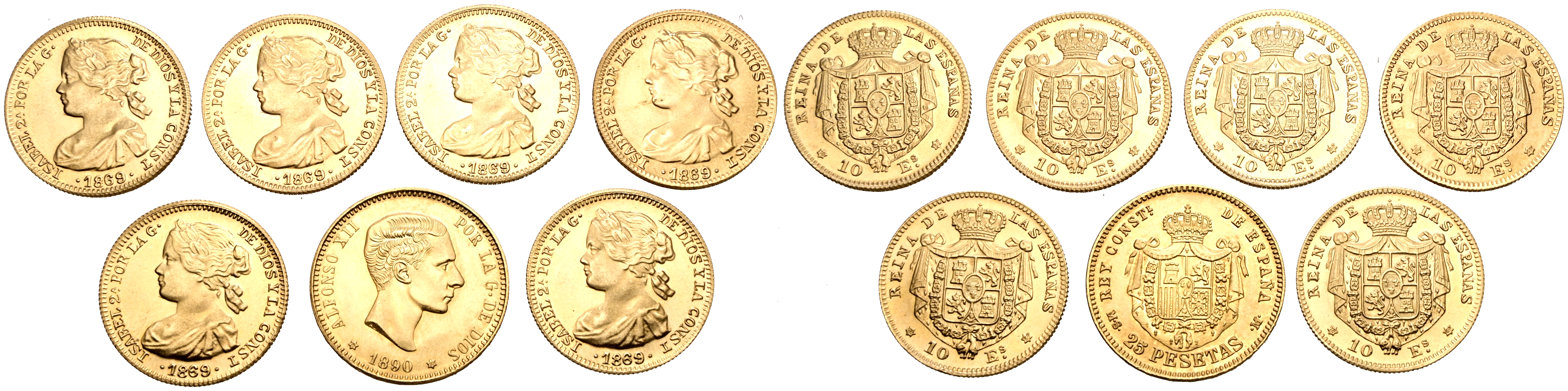 ISABEL II (1833-1868). Conjunto de 7 monedas fantasía: 6 de 10 Escudos de 1869 y 1 de 25 Pesetas de 1890 de Alfonso XII. Peso total del conjunto: 55,31g. Oro de 0,700 milésismas. Excelente estado de conservación. A EXAMINAR.