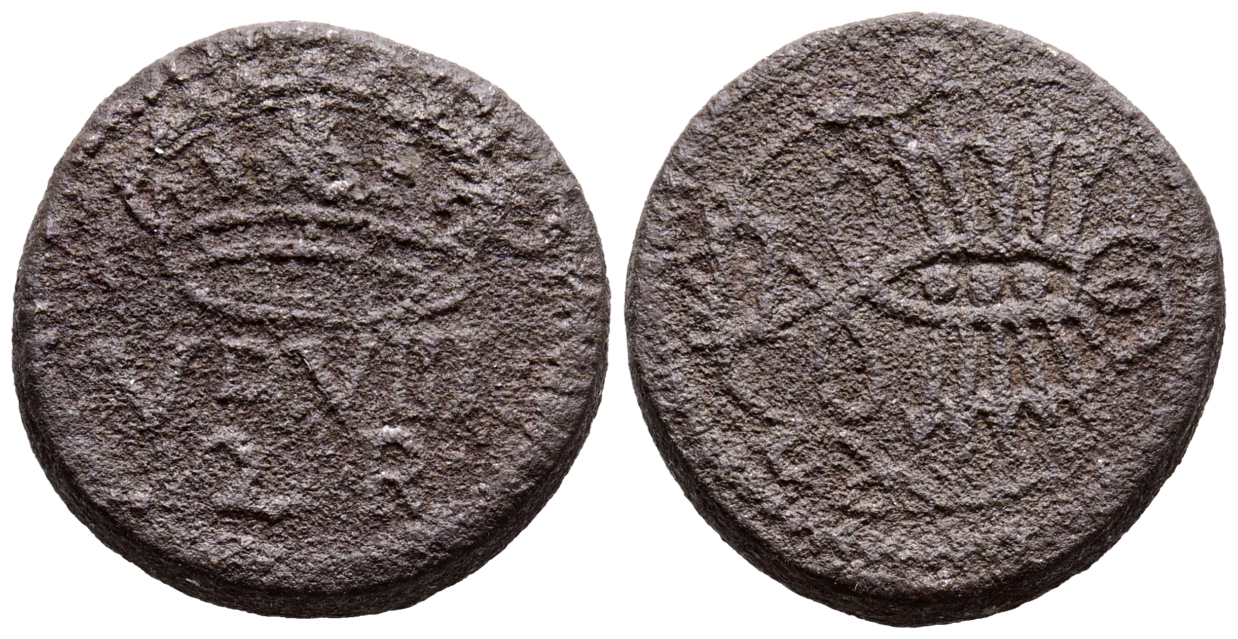 Ponderal de 2 reales. (Ae. 6,03g/17mm). S/D. (Mateu y Llopis-45 anv.). Anv: VDVIIIG / ·2·R·. Bajo corona real. Rev: Yugo y flechas. MBC