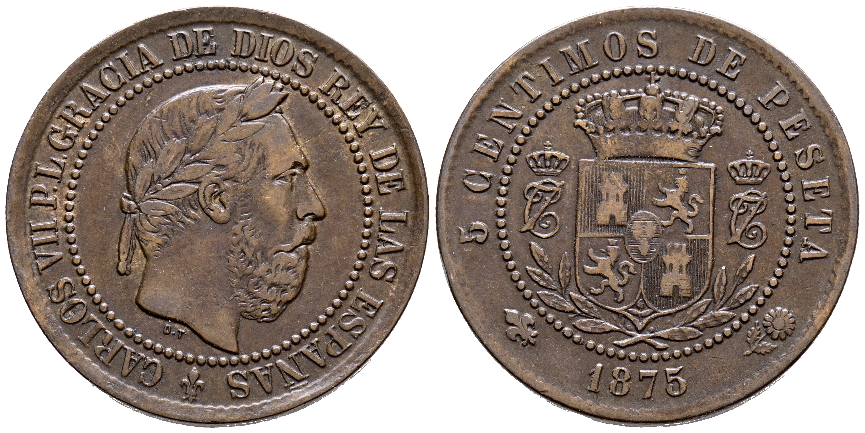 CARLOS VII (1868-1909). 5 Céntimos. (Ae. 5,03g/25mm). 1875. Oñate. (Cal-2019-2). MBC+. Reverso coincidente.