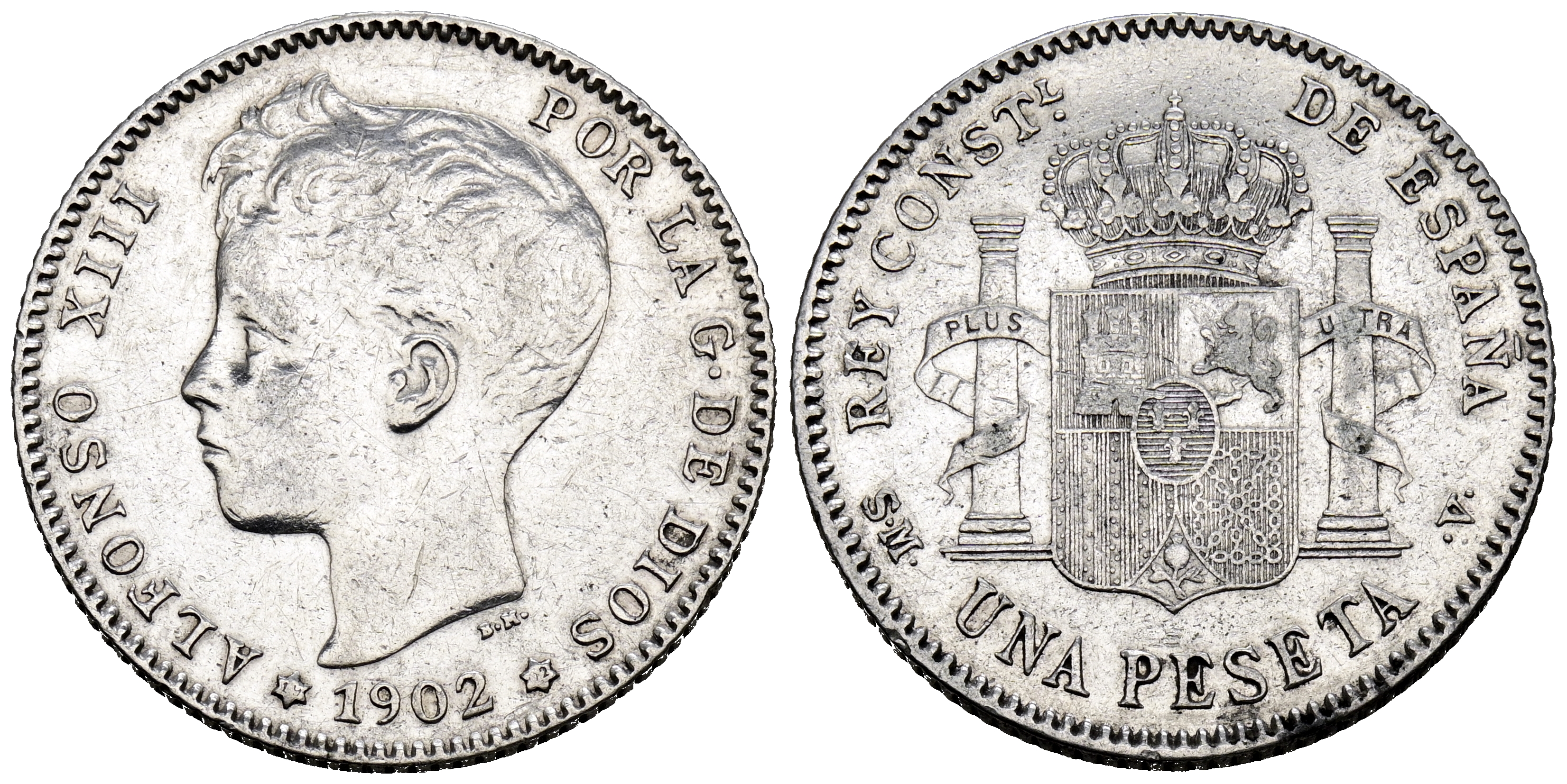 ALFONSO XIII (1885-1931). 1 Peseta. (Ar. 4,89g/23mm). 1902 *19-02. Madrid SMV. (Cal-2019-64). MBC. Estrellas flojas pero visibles. Escasa. Abrillantada.