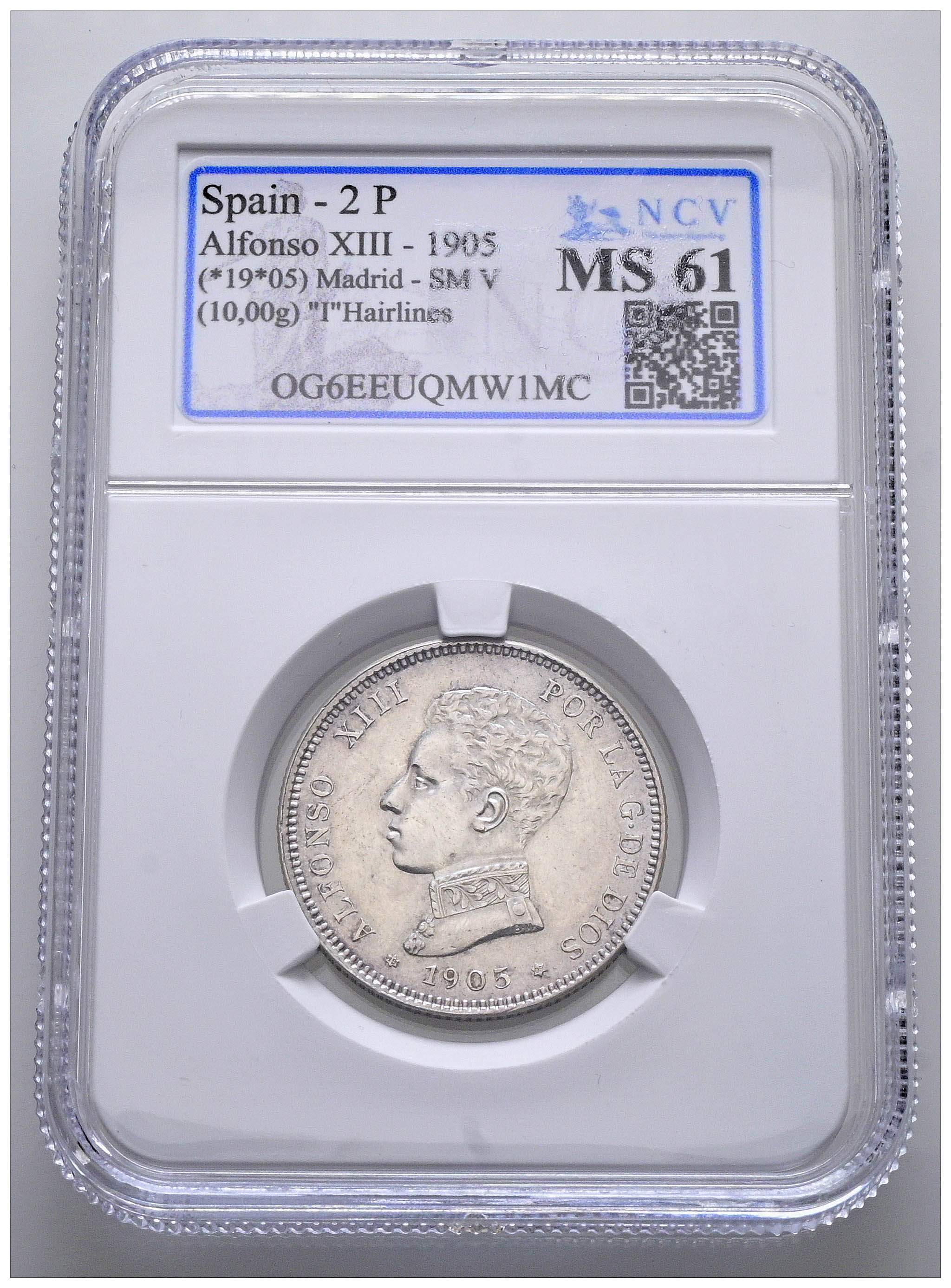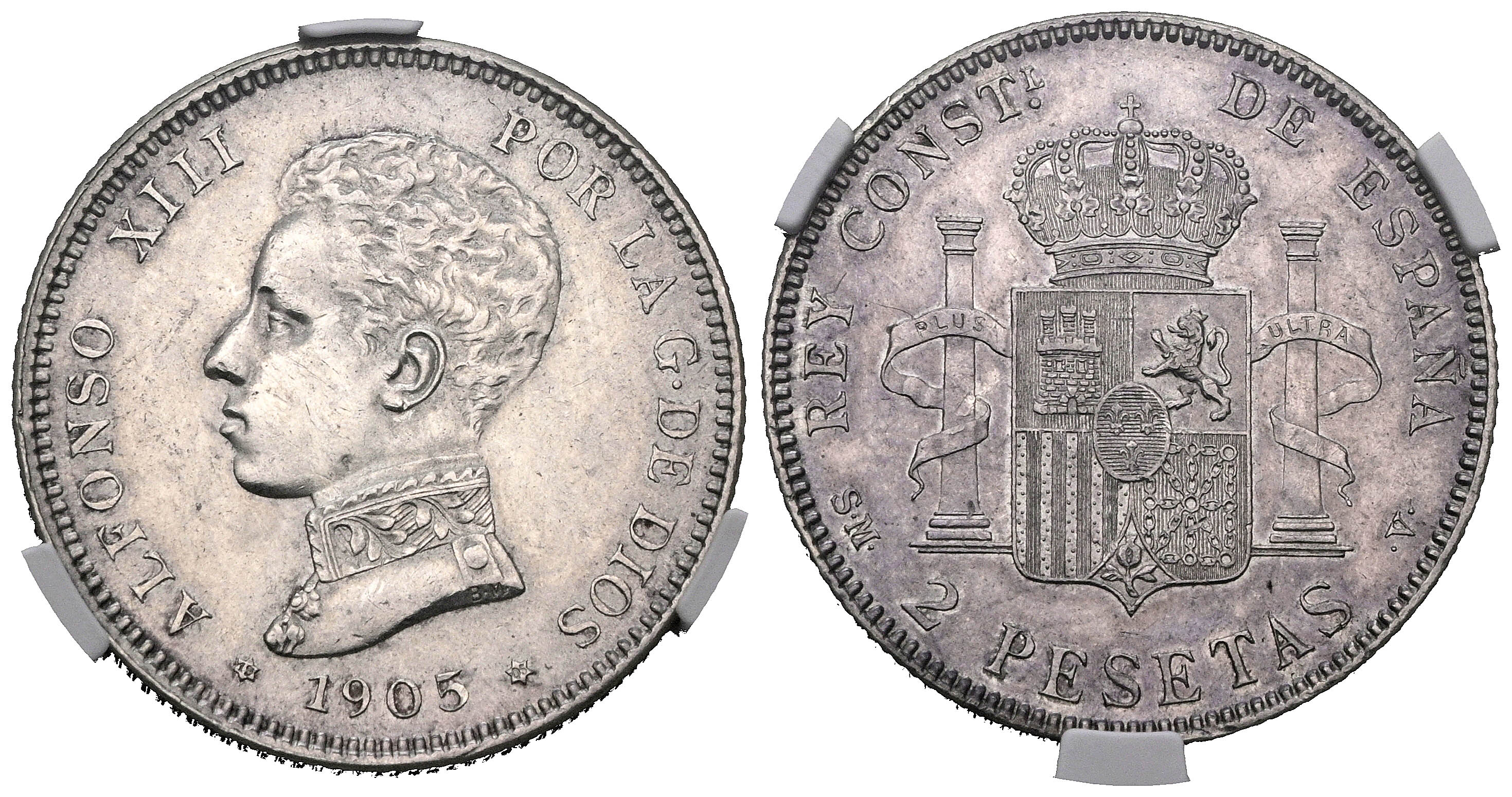 ALFONSO XIII (1885-1931). 2 Pesetas. (Ar. 10,00g/27mm). 1905 *19-05. Madrid SMV. (Cal-2019-88). Encapsulado por NCV MS61, I Hairline.