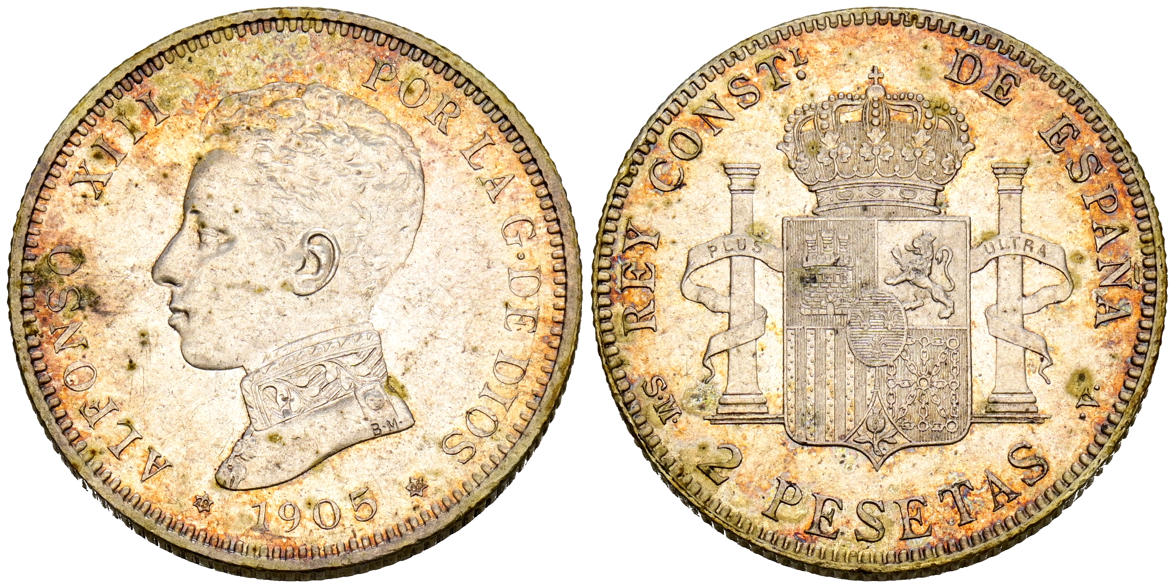 ALFONSO XIII (1885-1931). 2 Pesetas. (Ar. 10,00g/27mm). 1905 *19-05. Madrid SMV. (Cal-2019-88). EBC. Preciosa pátina.