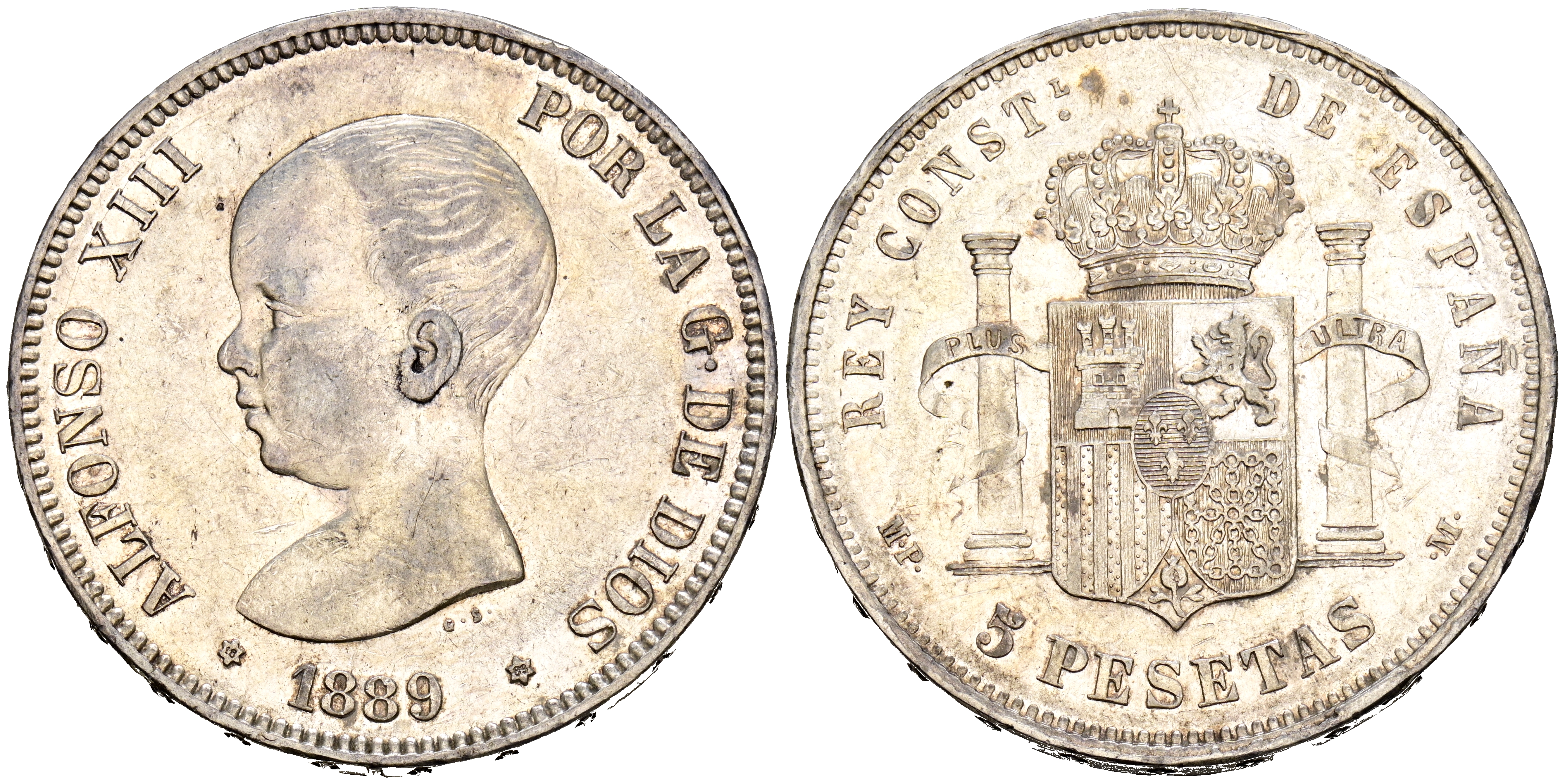 ALFONSO XIII (1885-1931). 5 Pesetas. (Ar. 24,81g/37mm). 1889 *18-89. Madrid MPM. (Cal-2019-93). MBC+. Rayitas y leves marquitas.