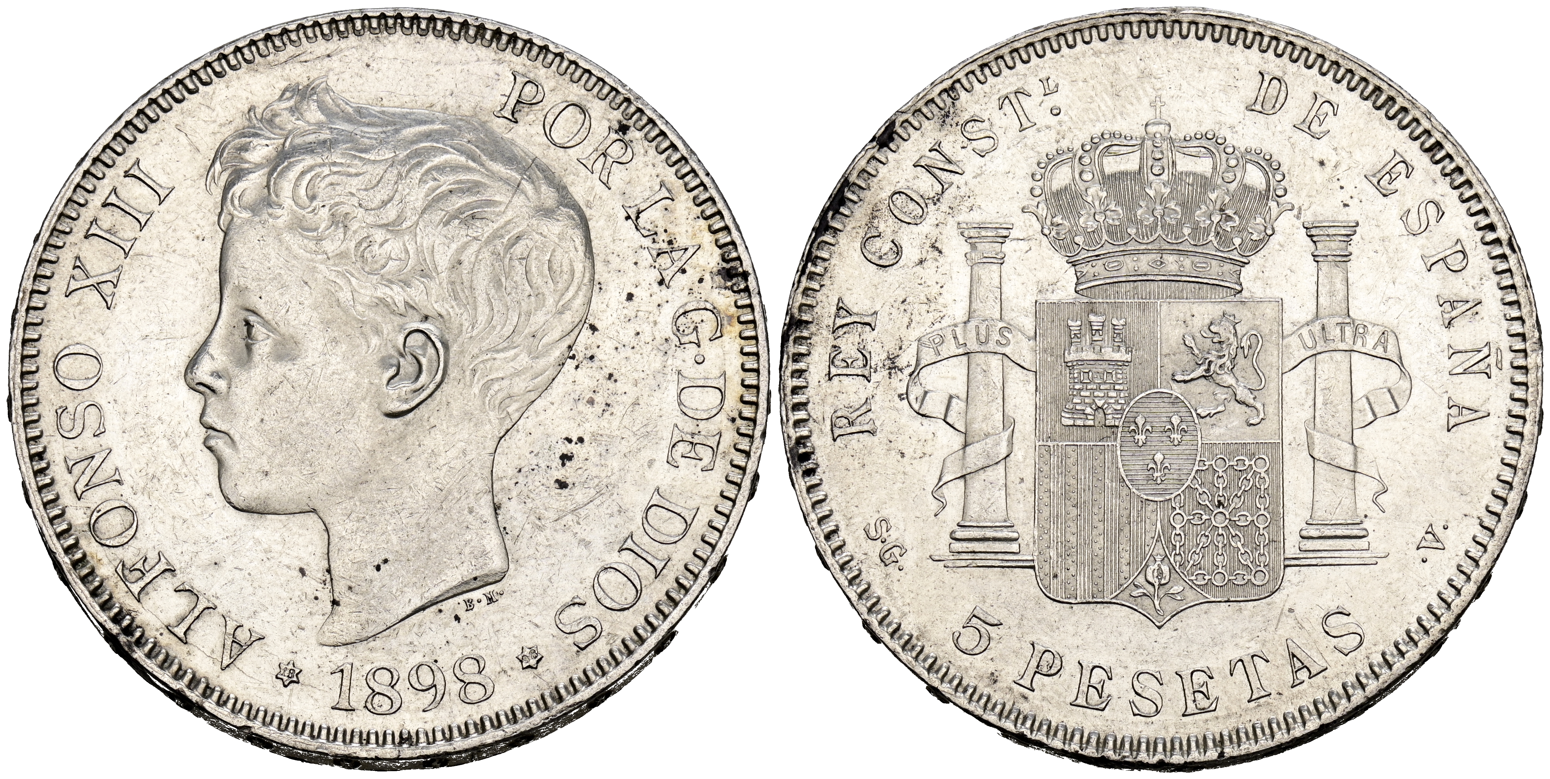 ALFONSO XIII (1885-1931). 5 Pesetas. (Ar. 25,14g/37mm). 1898 *18-98. Madrid SGV. (Cal-2019-109). EBC-. Leves rayitas. Restos de brillo original.