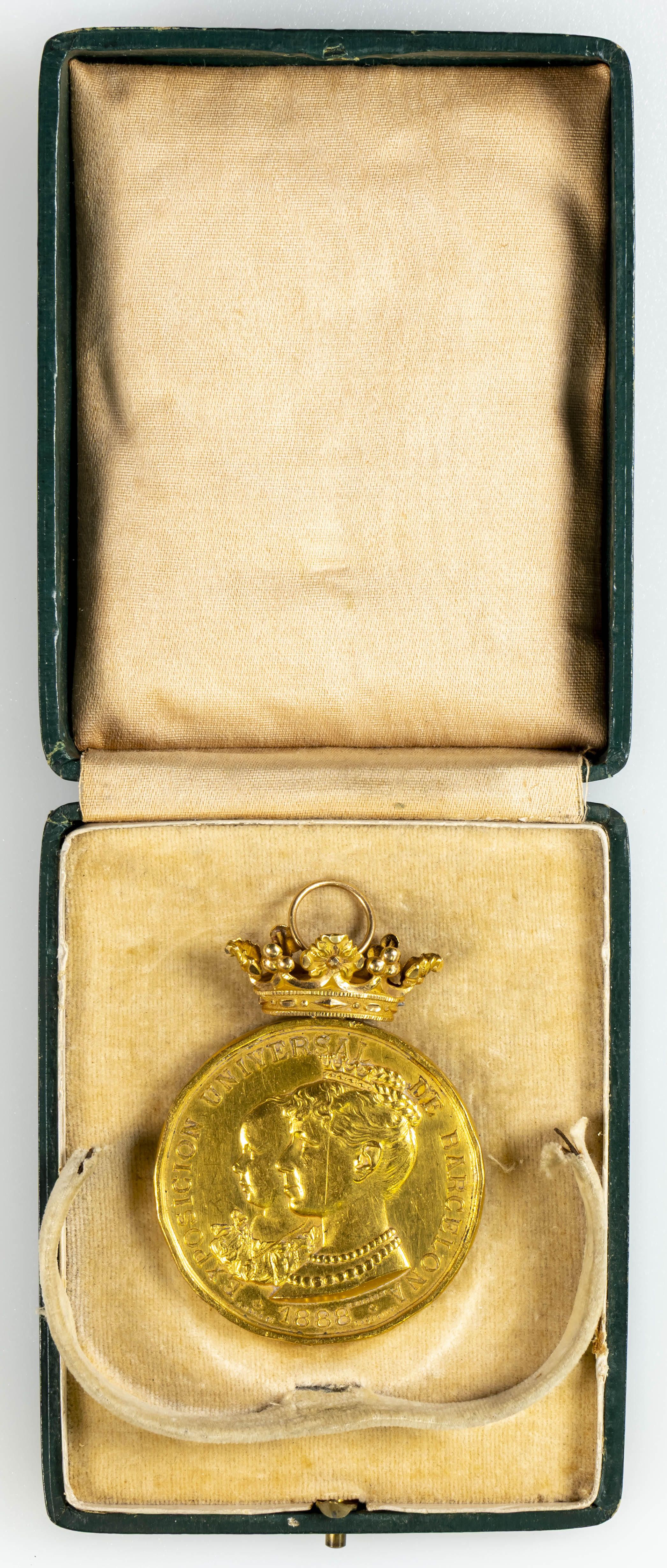 ALFONSO XIII (1886-1931). Exposición Universal de Barcelona. (Ae-dorado. 60.02g/50mm). 1888. Grabadores: Solà, Arnay y Castells. Corona articulada y anilla original. (Cru.M 760a). SC. Incluye estuche de época.