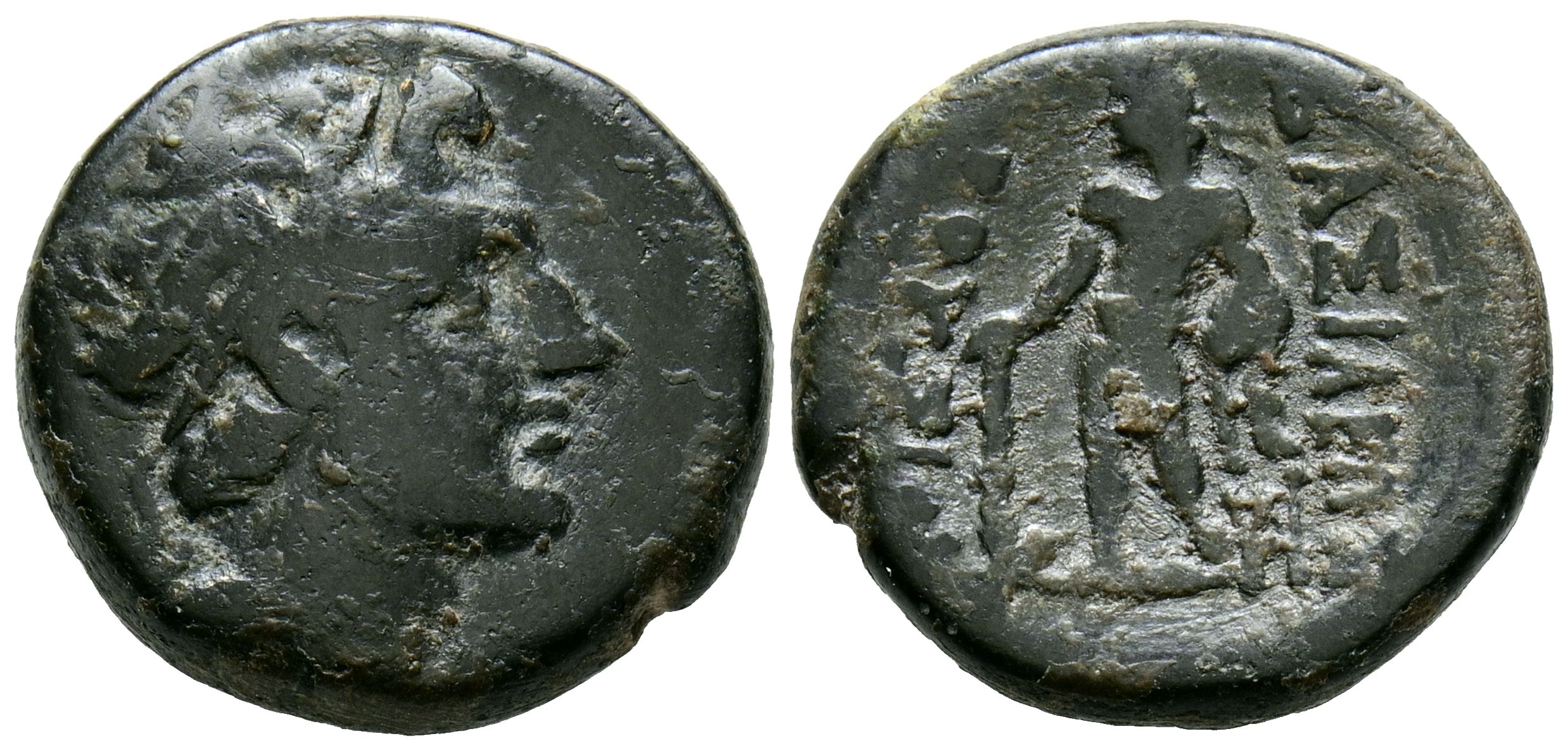 BITHYNIA, Prusias II. AE17. (Ae. 5,03g/17mm). 182-149 a.C. Nicomedia. (SNG von Aulock 258; SNG Copenhagen 631). Anv: Cabeza laureada de Prusias II a derecha. Rev: Heracles estante a izquierda portando clava y drapeado, detrás monograma griego, alrede dor leyenda griega: ΒΑΣΙΛΕΩΣ ΠΡΟΥΣΙΟΥ. MBC.