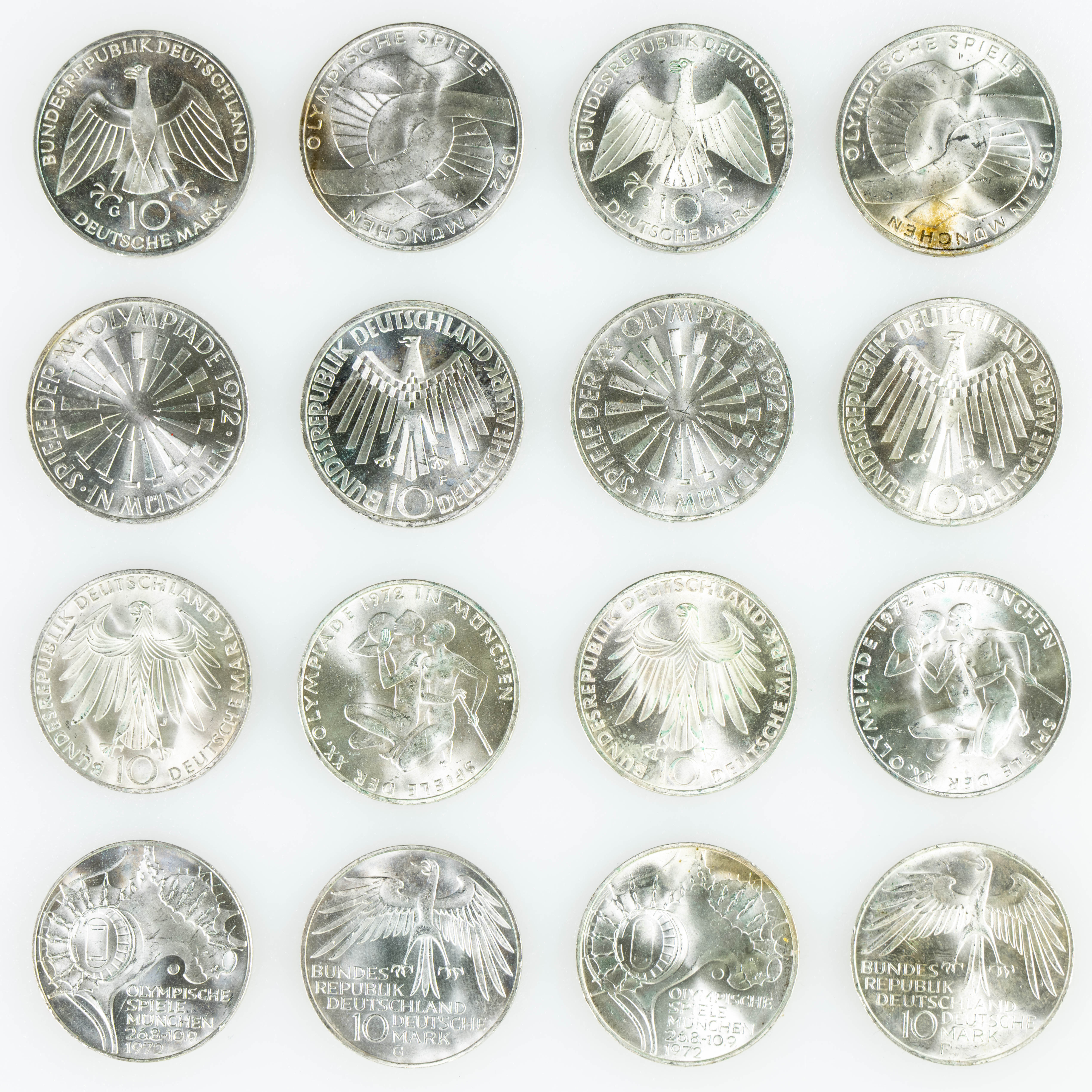 ALEMANIA. Conjunto de 16 monedas de 10 Mark conmemorativos de los JJOO de Munich. 1972. 4 Tipos diferentes con sus 4 cecas. Sin repeticiones. A EXAMINAR.