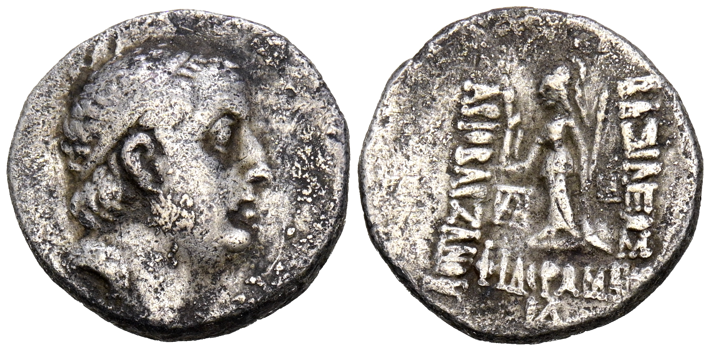 REYES DE CAPADOCIA, Ariobarzanes I Philoromaios. Dracma. (Ar. 4,12g/17mm). 95-63 a.C. Eusebia. (Simonetta 45a; HGC 7, 846). Anv: Cabeza diademada a derecha. Rev: Atenas estante a izquierda portando Nike, lanza y escudo, delante monograma: ΓA, alreded or leyenda griega: ΒΑΣΙΛΕΩΣ ΑΡΙΟΒΑΡΖAΝOY ΦΙΛΟΡΩΜΑΙOY. MBC.