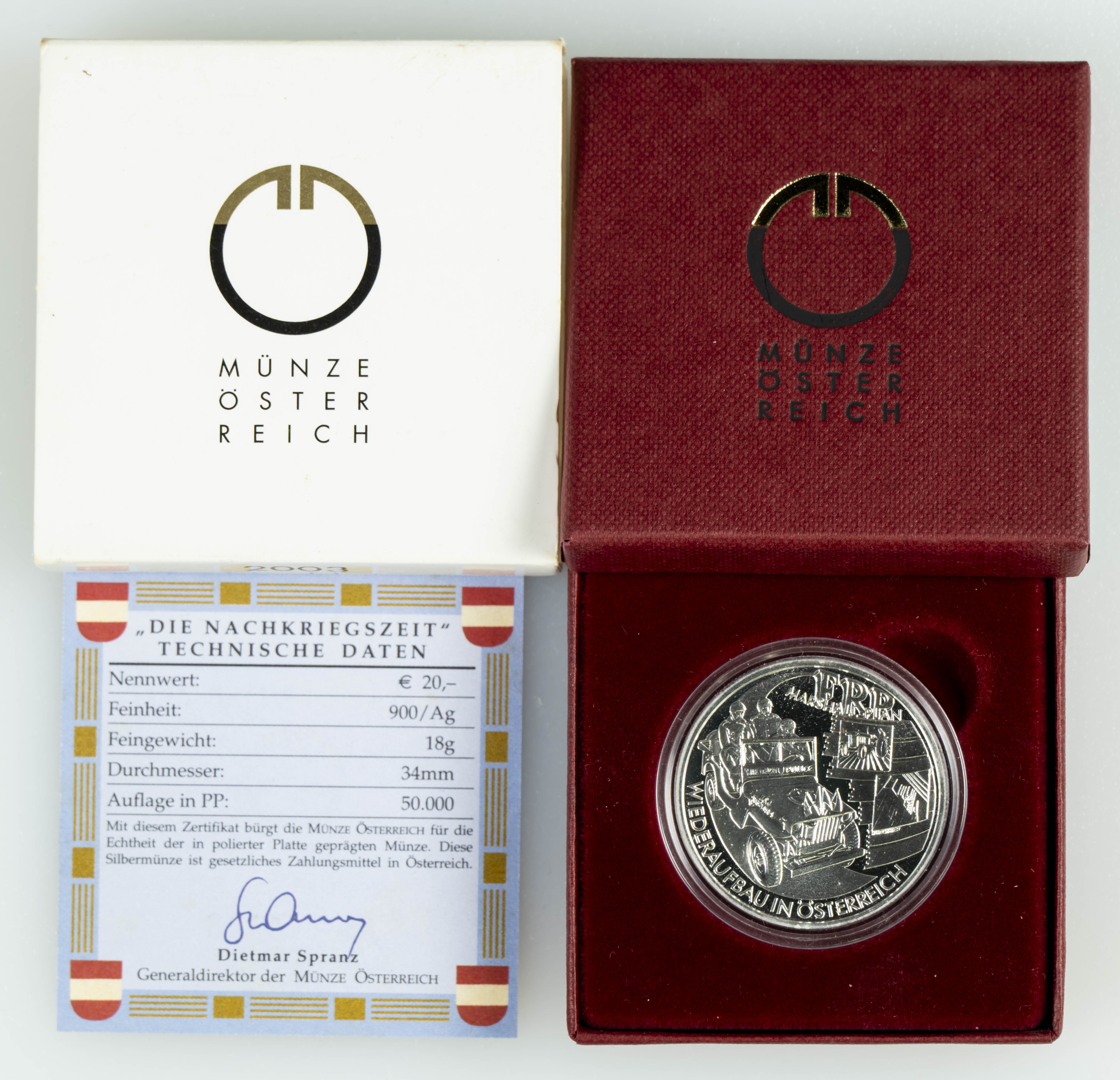 AUSTRIA. 20 Euros. (Ar. 20,01g/34mm). 2003. Plan Marshall. (Km#3107). PROOF. Incluye estuche y certificado de autenticidad.