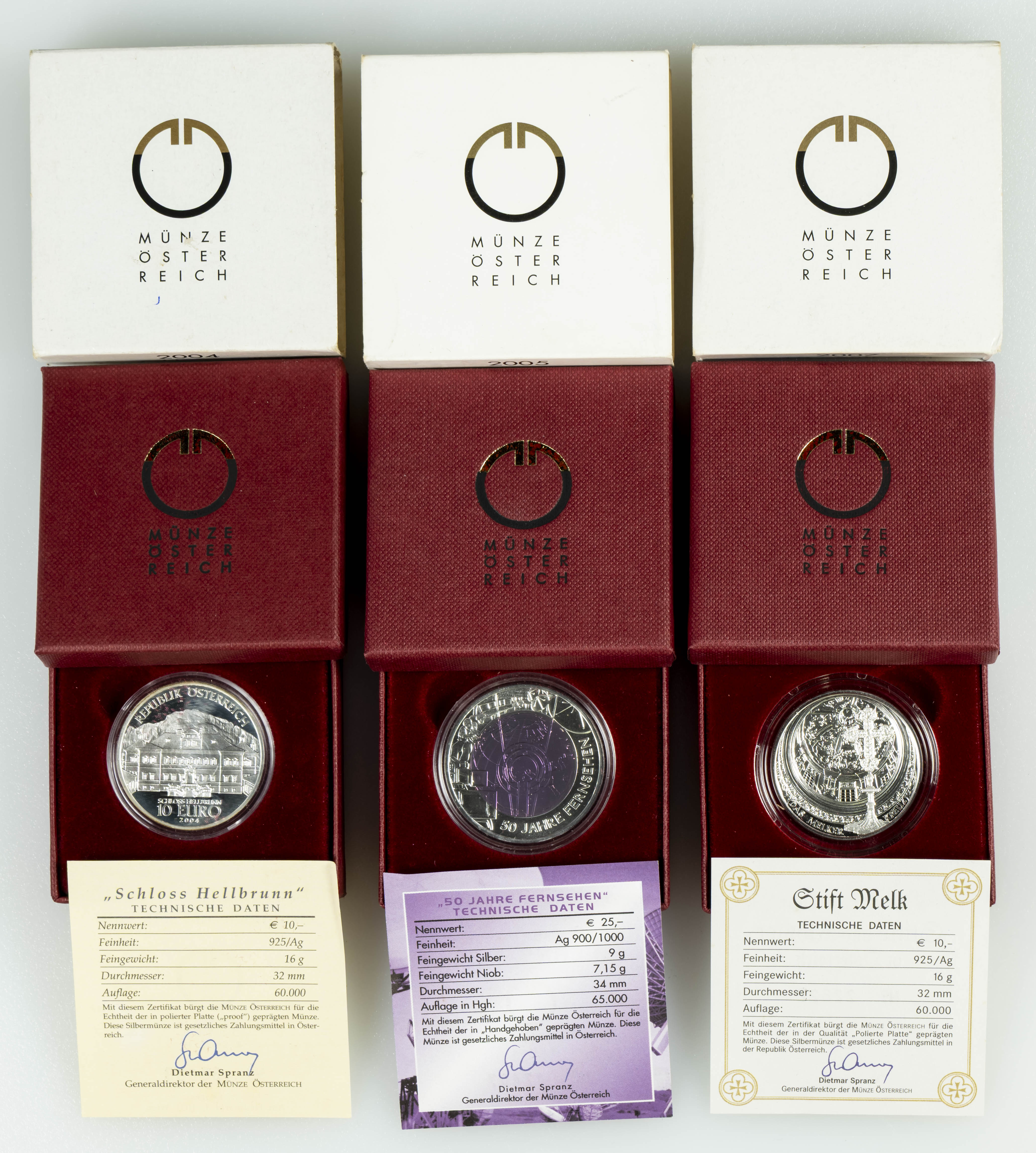 AUSTRIA. Conjunto de 3 estuches completos de 10 Euros en plata (2004 y 2007) y 25€ en plata/niobio (2005). SC. Incluyen certificados de autenticidad.