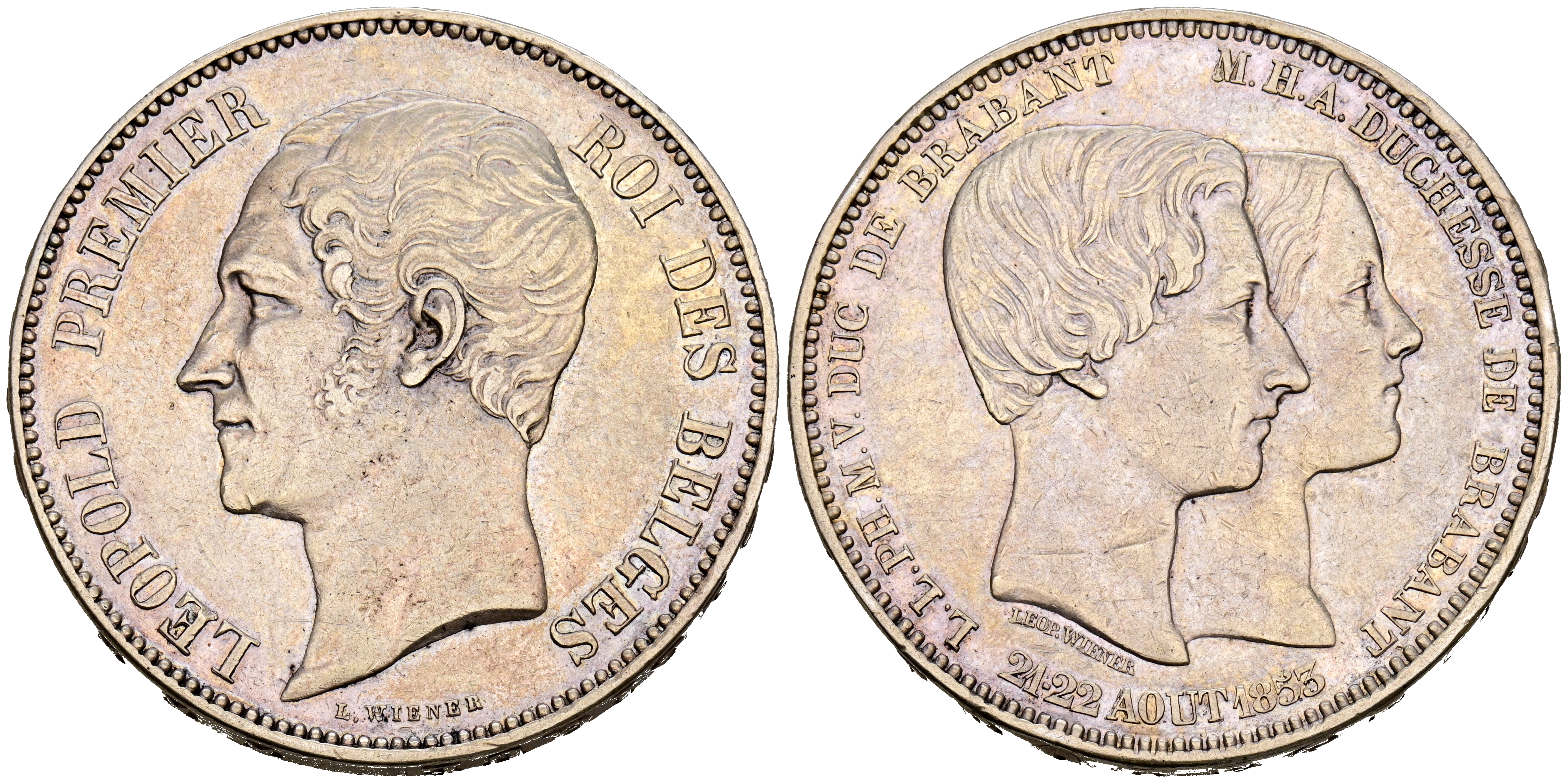 BÉLGICA, Leopoldo I. 5 Francs. (Ar. 24,79g/37mm). 1853. Boda de los Duques de Bravante. (Km#XM2.1). MBC+. Escasa.