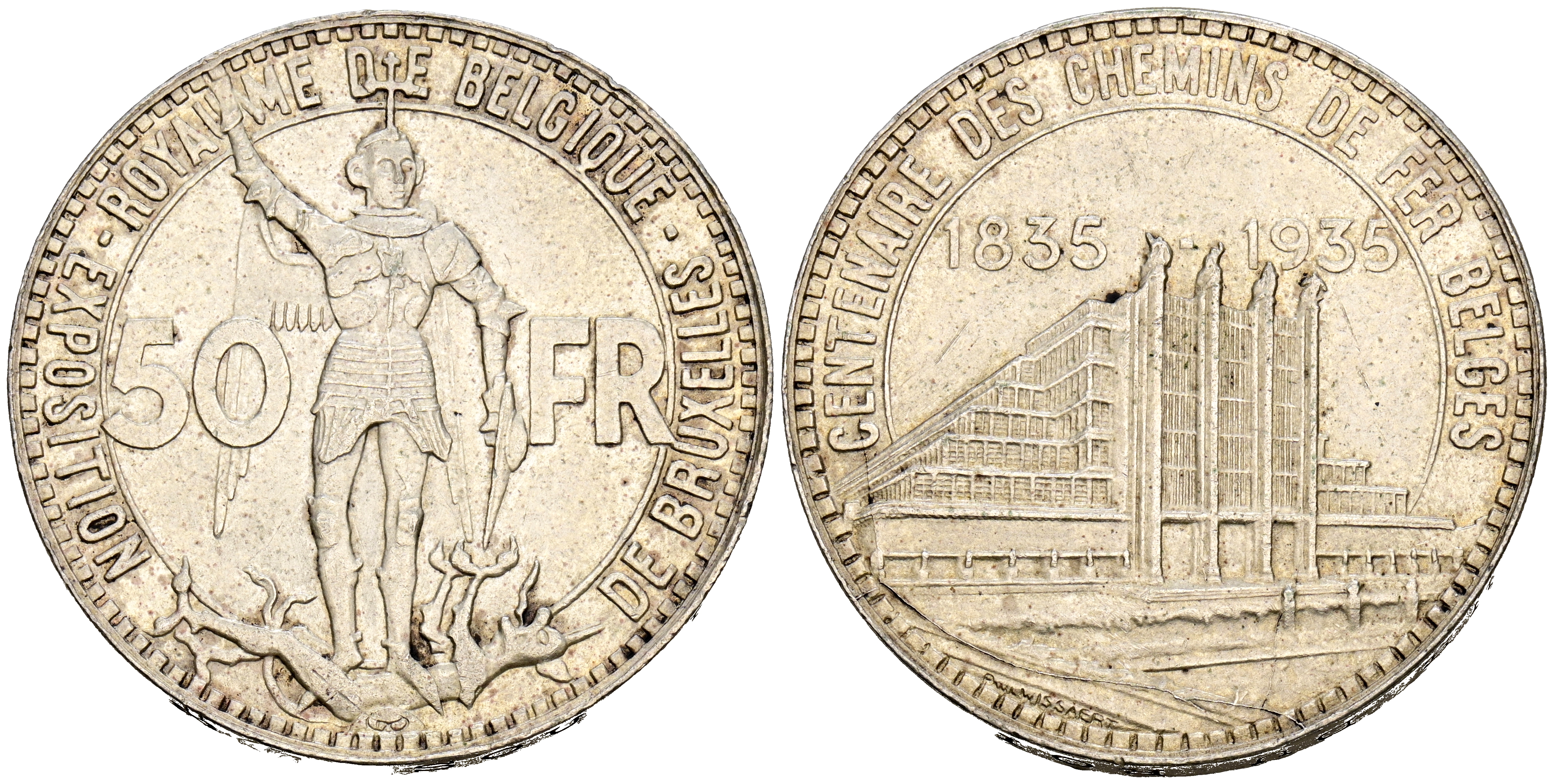 BÉLGICA, Leopoldo III. 50 Francs. (Ar. 21,95g/35mm). 1935. Centenario del Ferrocarril (1835-1935). Leyendas en francés. (Km#106.1). MBC+.