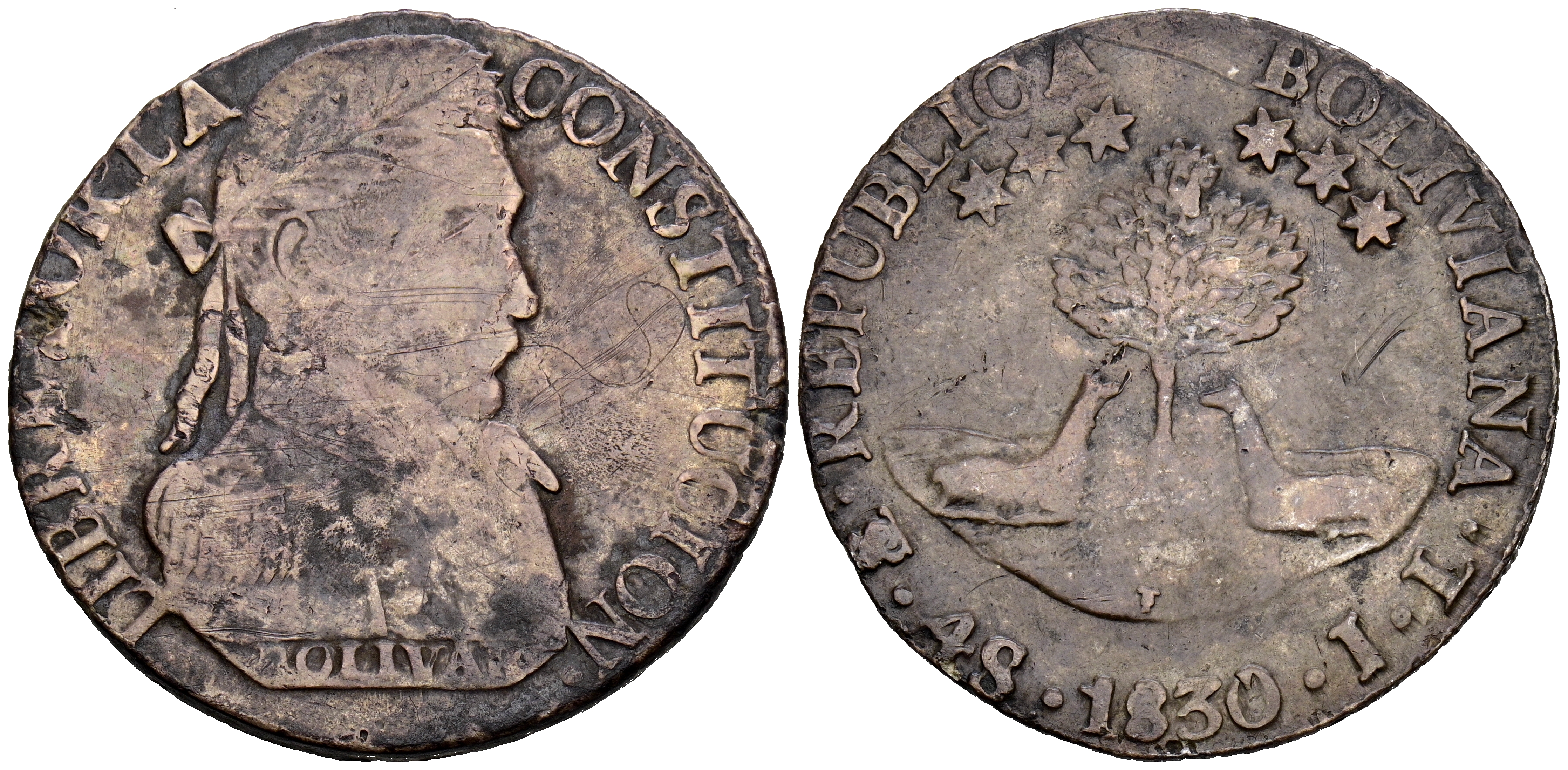 BOLIVIA. 4 Soles. (Ar. 13,01g/31mm). 1830. Potosí IL. (Km#96a). MBC. Pátina oscura.